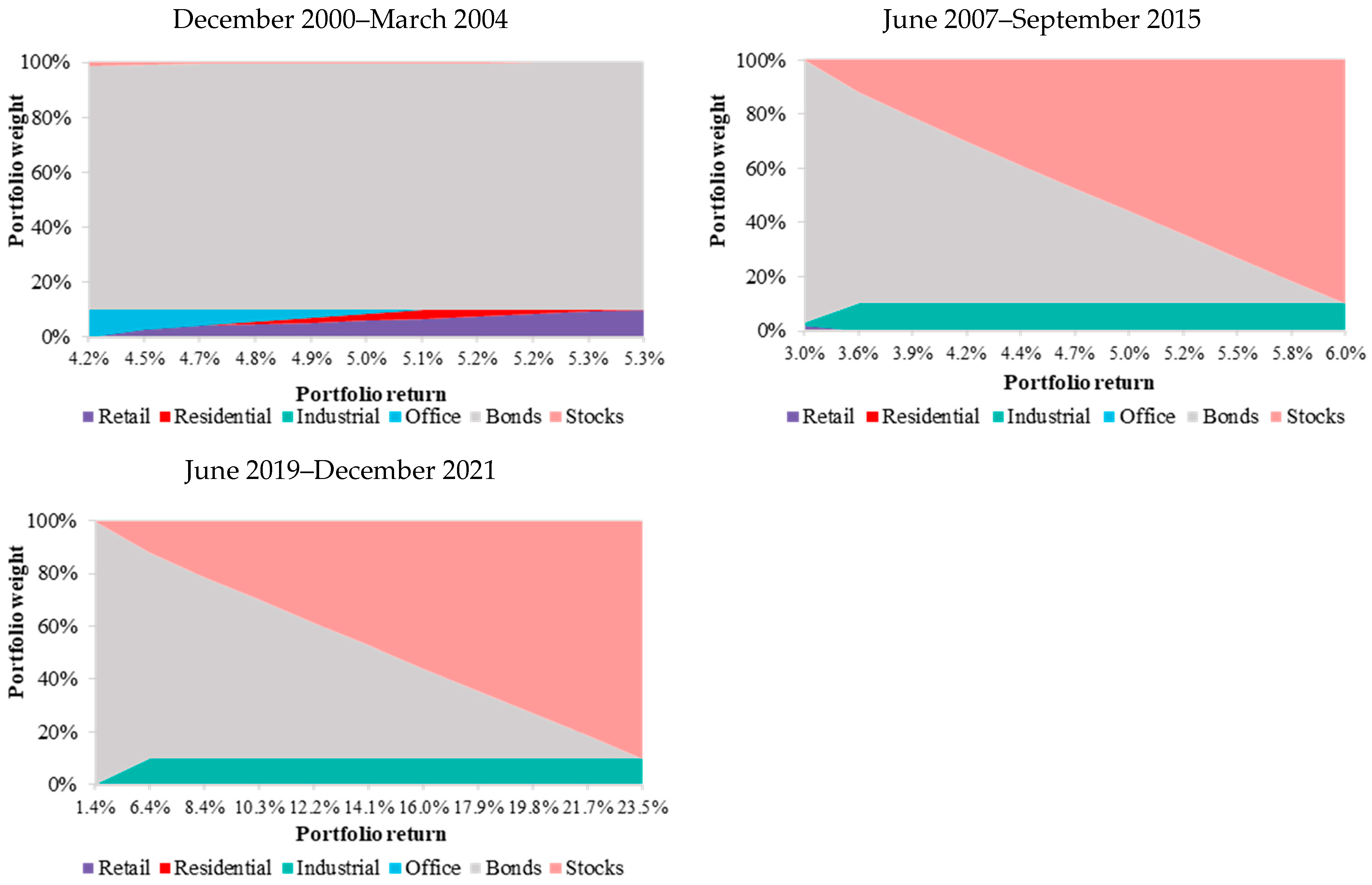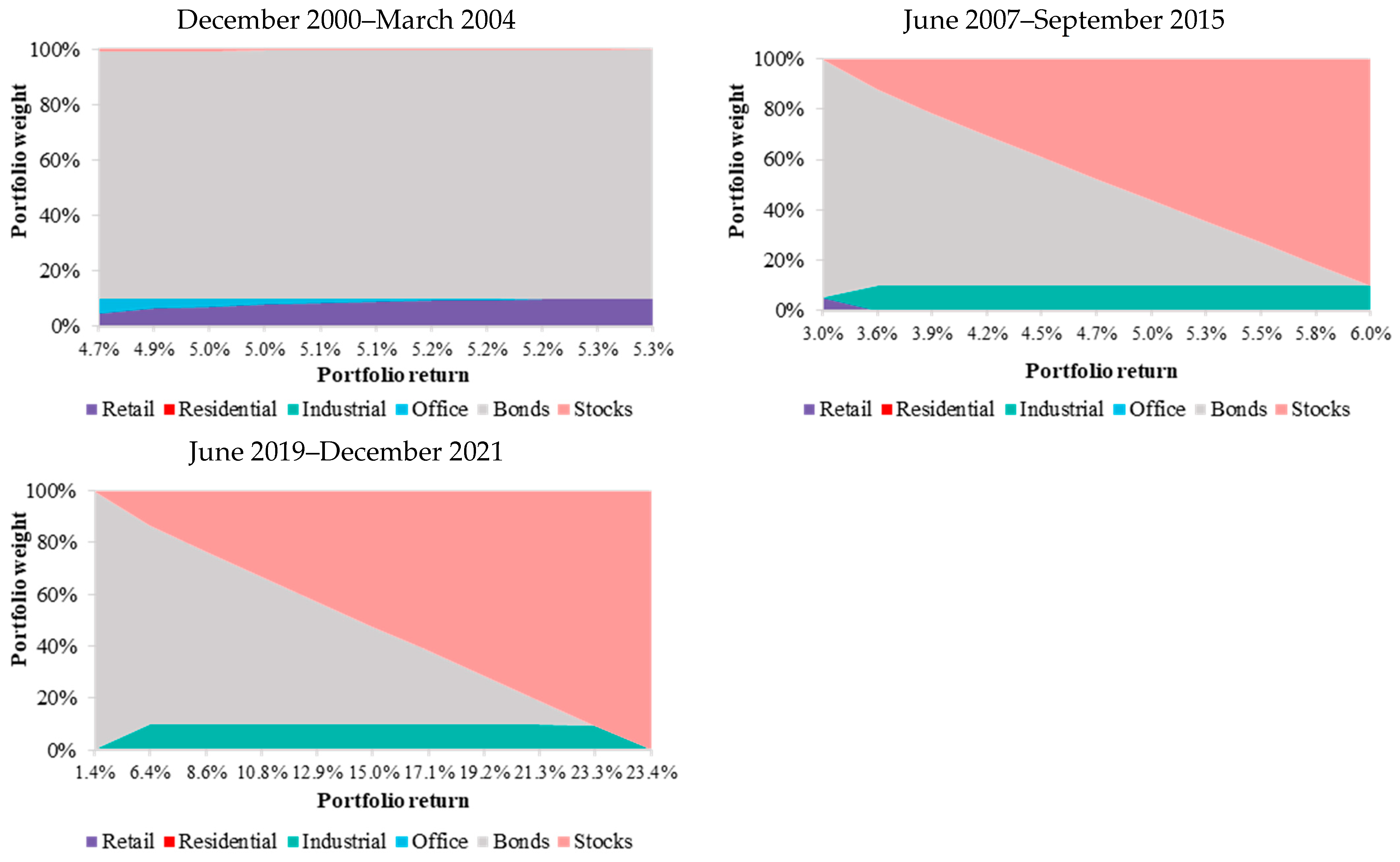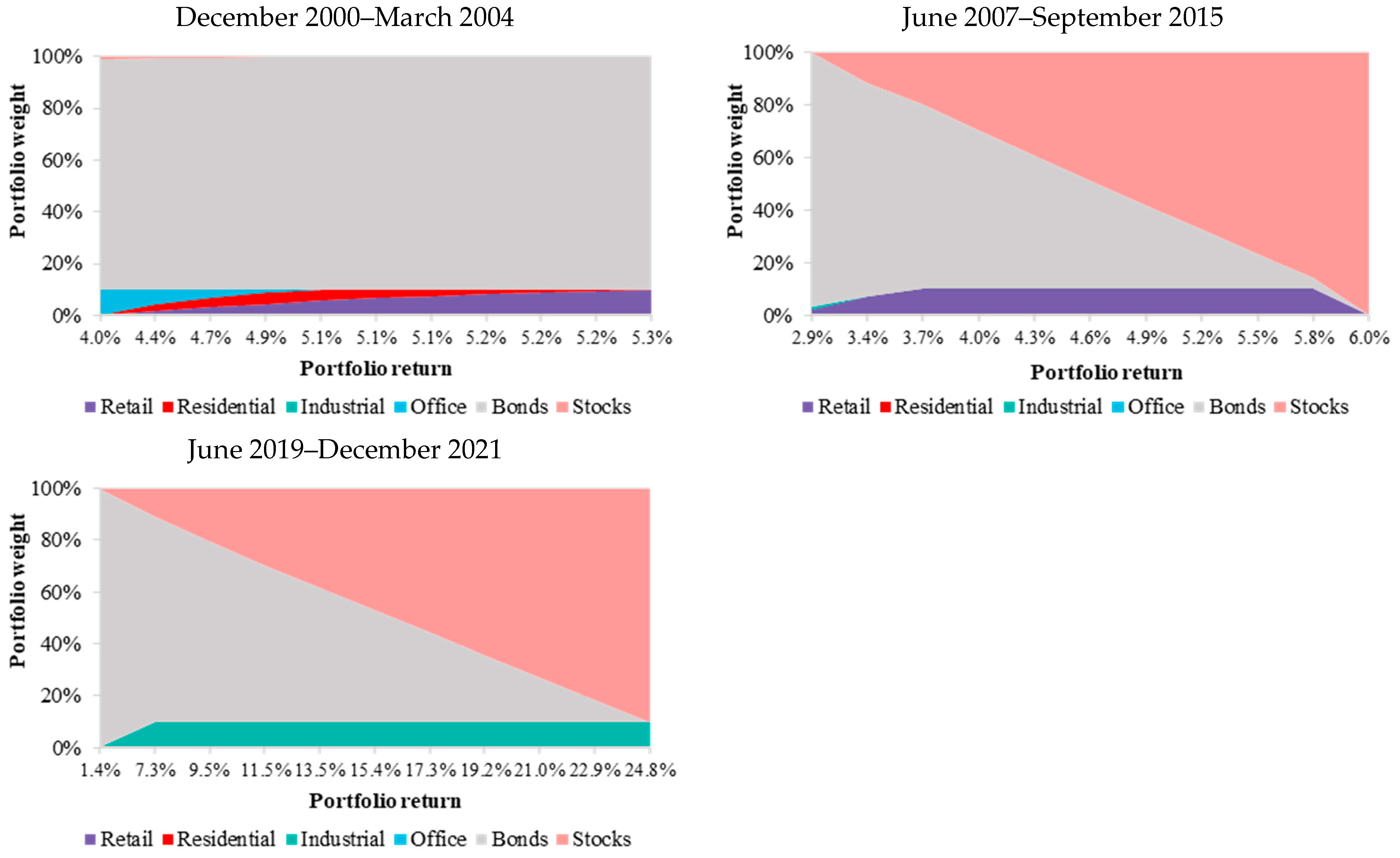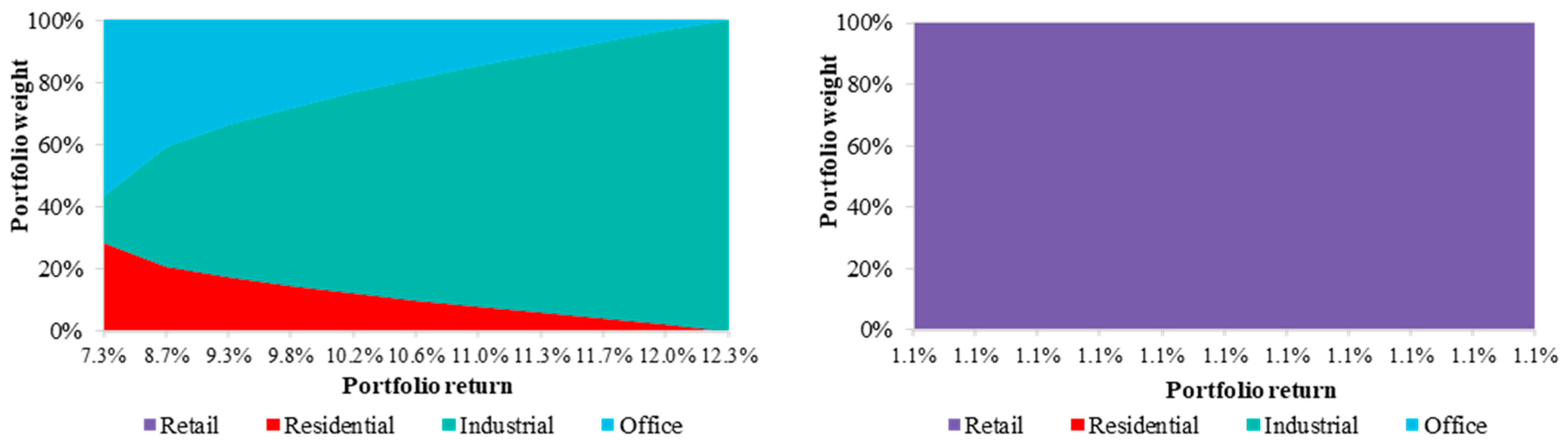 14]. These results revealed that the actual real estate allocation for these US institutional investors and investment managers was approximately 10%. Asset allocation diagrams exhibited the estimations of portfolio asset allocations to unlisted sector-specific real estate across the various risk–return spectrums. Within the two scenarios, short-selling of bonds and stocks is not allowed.