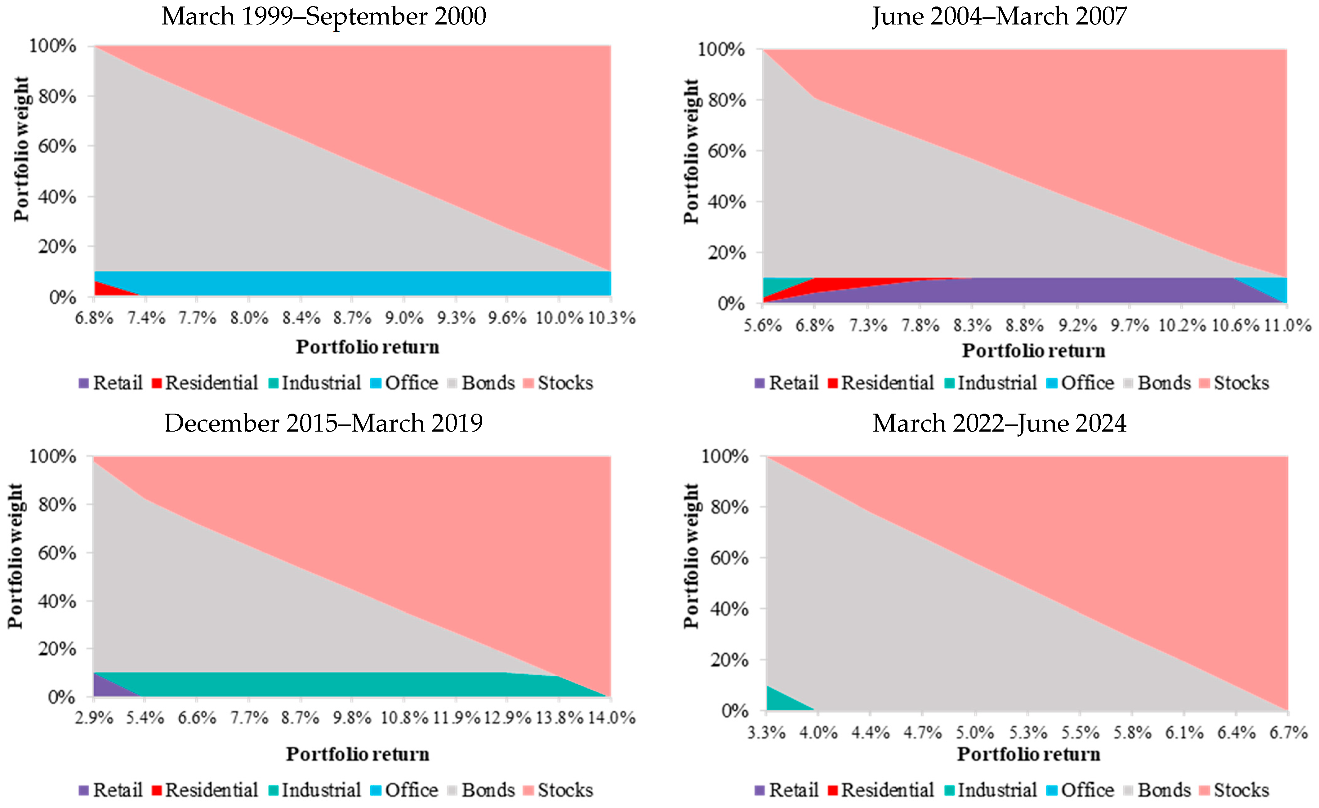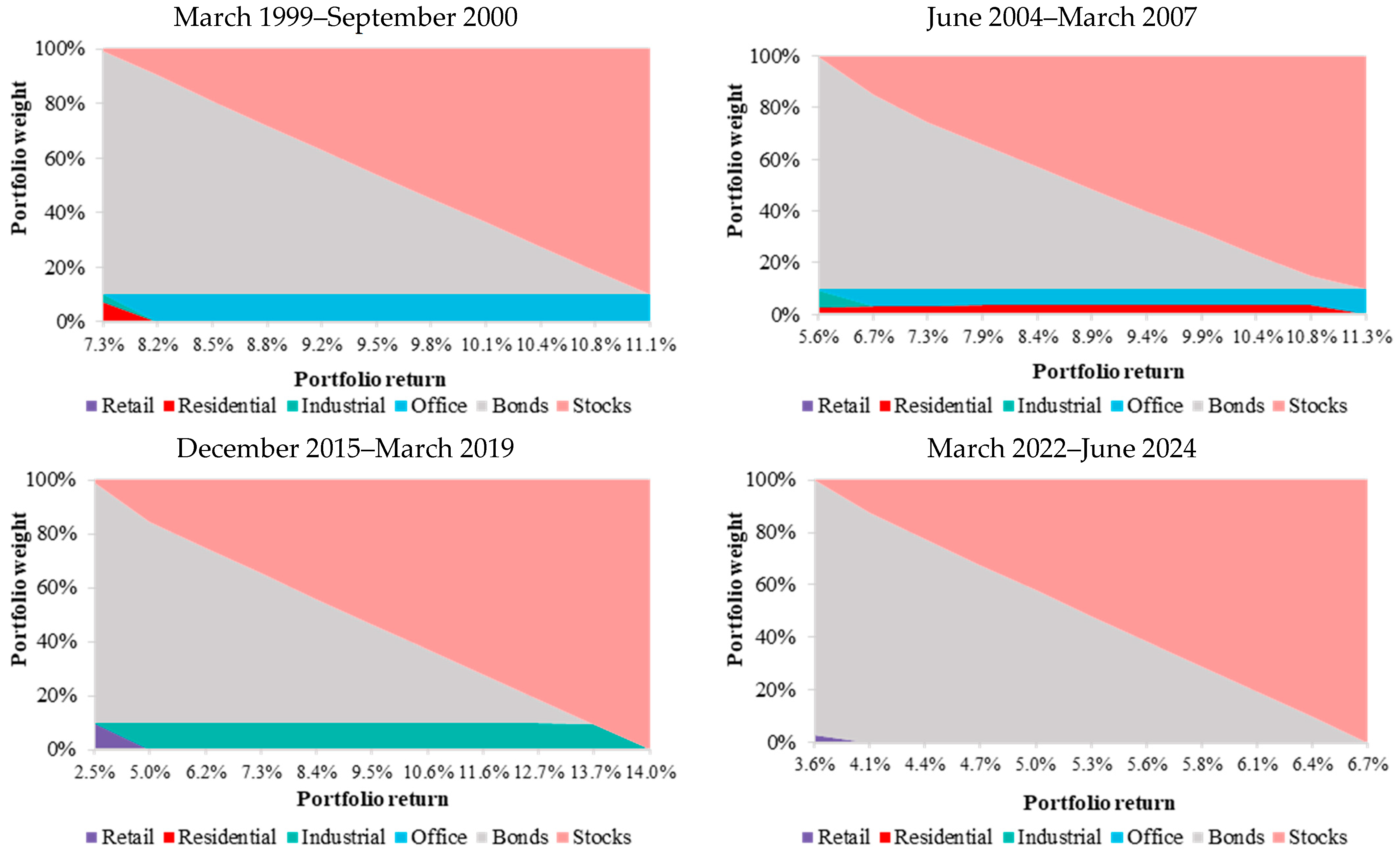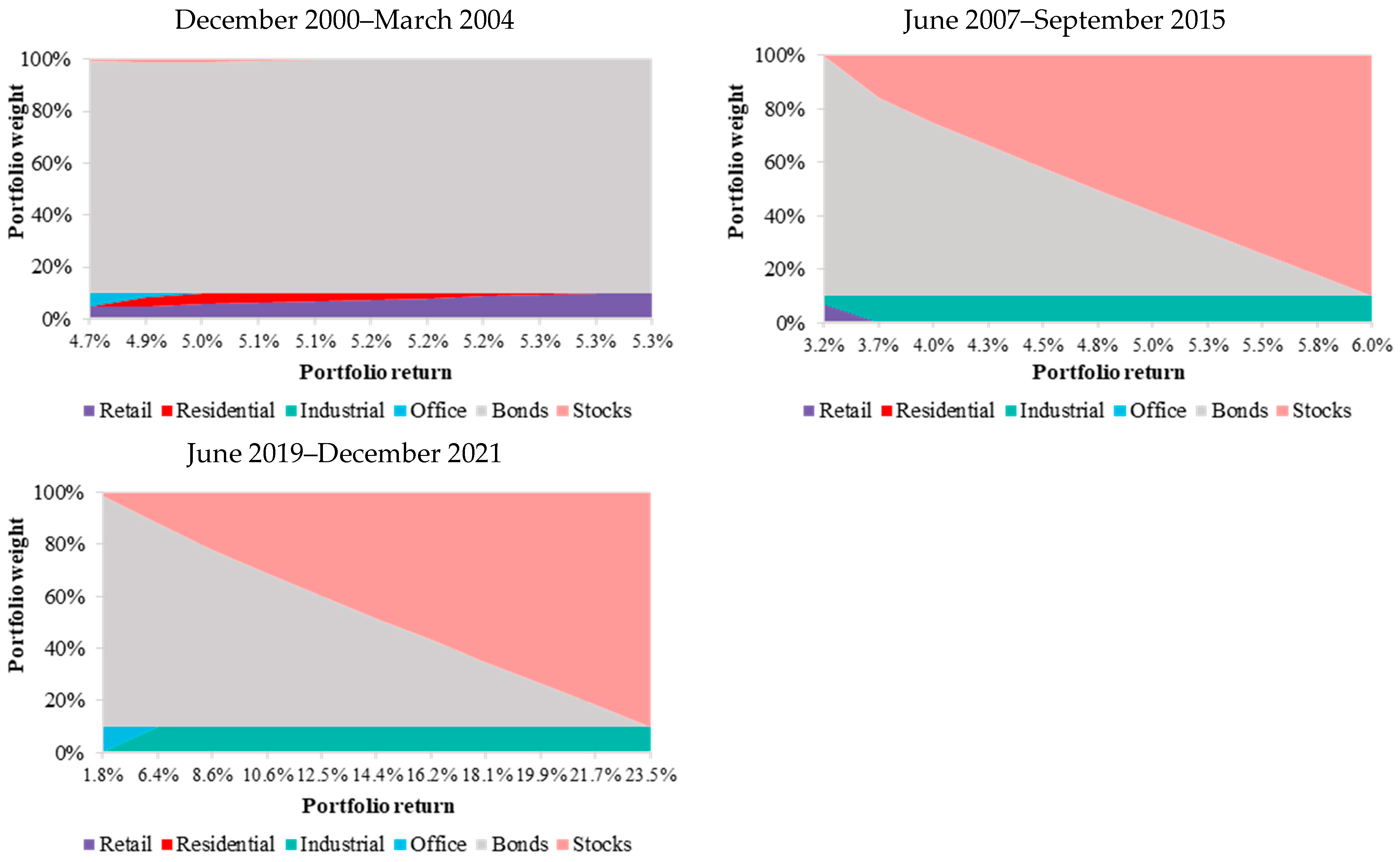 14]. These results revealed that the actual real estate allocation for these US institutional investors and investment managers was approximately 10%. Asset allocation diagrams exhibited the estimations of portfolio asset allocations to unlisted sector-specific real estate across the various risk–return spectrums. Within the two scenarios, short-selling of bonds and stocks is not allowed.