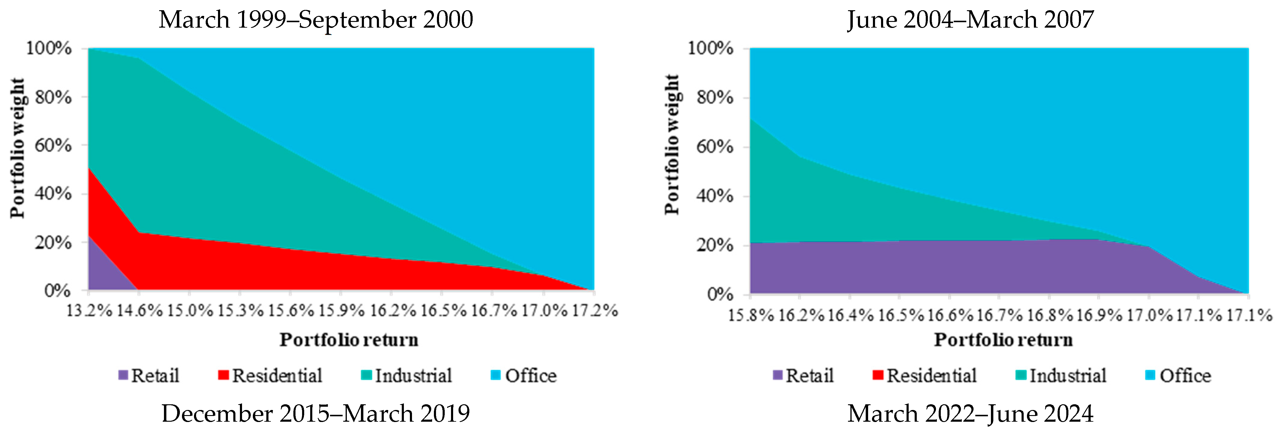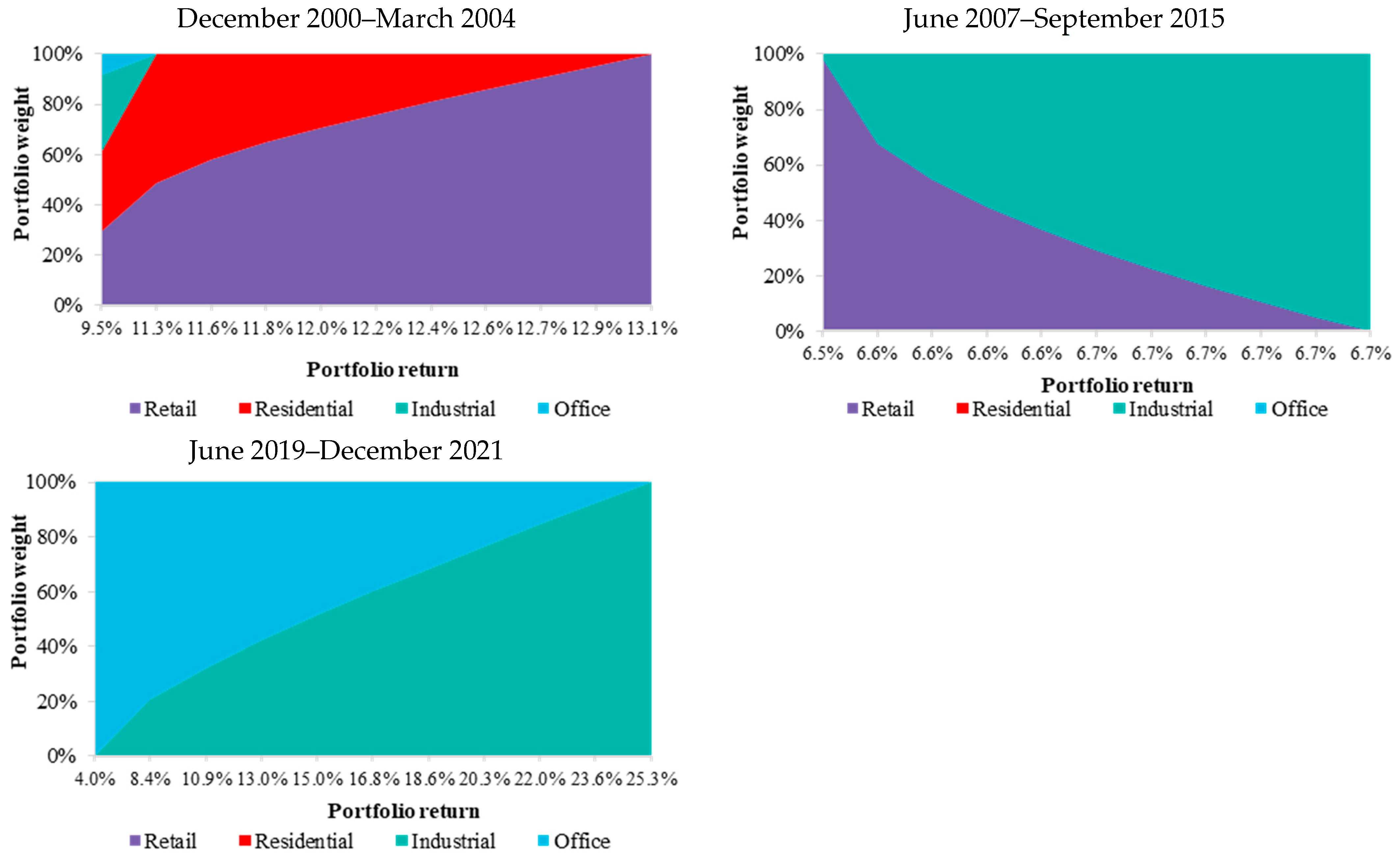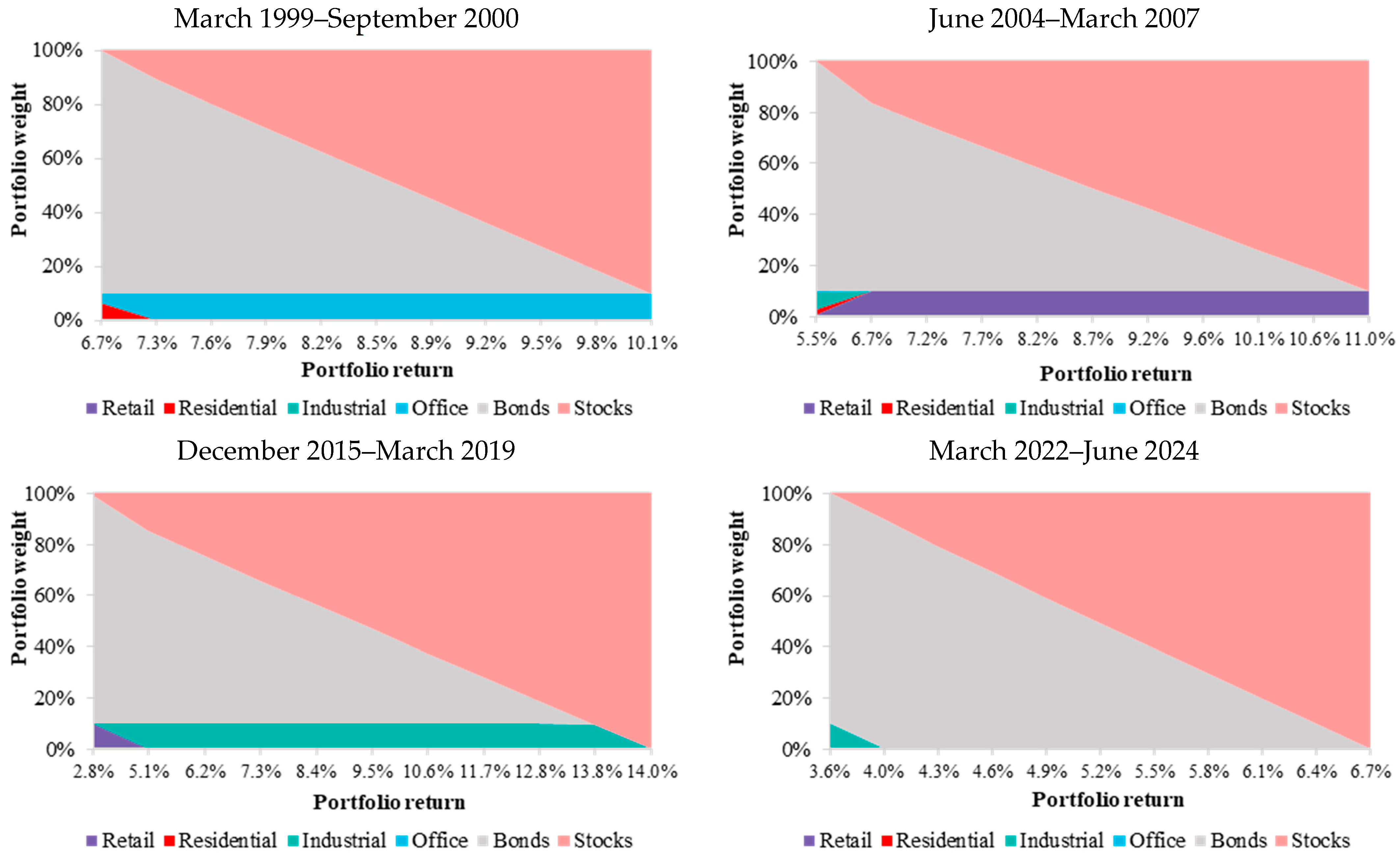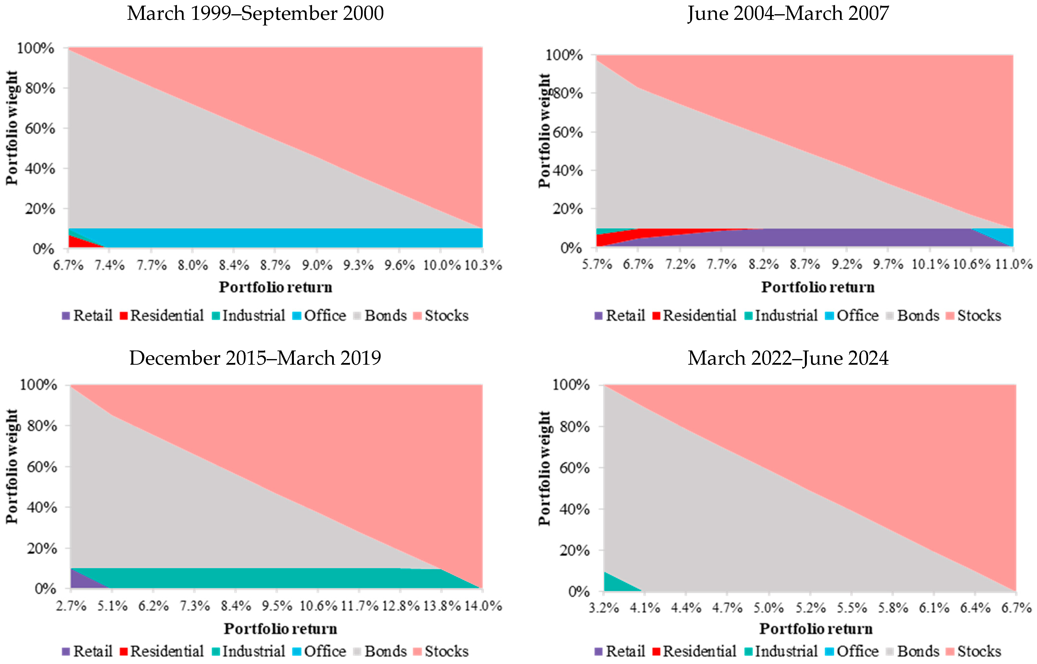 14]. These results revealed that the actual real estate allocation for these US institutional investors and investment managers was approximately 10%. Asset allocation diagrams exhibited the estimations of portfolio asset allocations to unlisted sector-specific real estate across the various risk–return spectrums. Within the two scenarios, short-selling of bonds and stocks is not allowed.