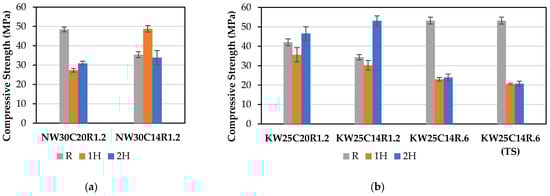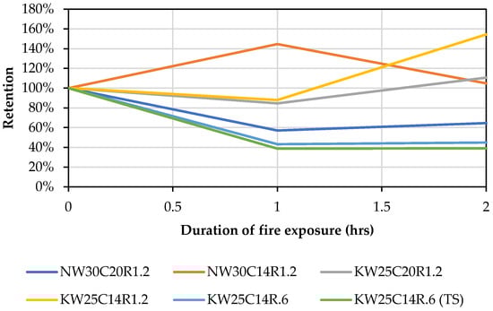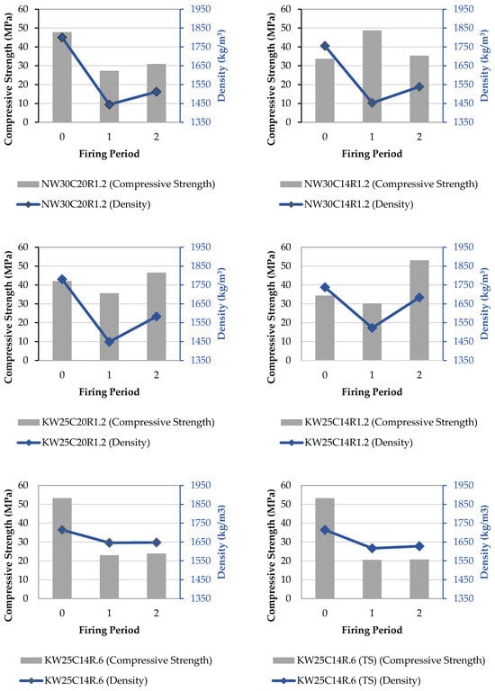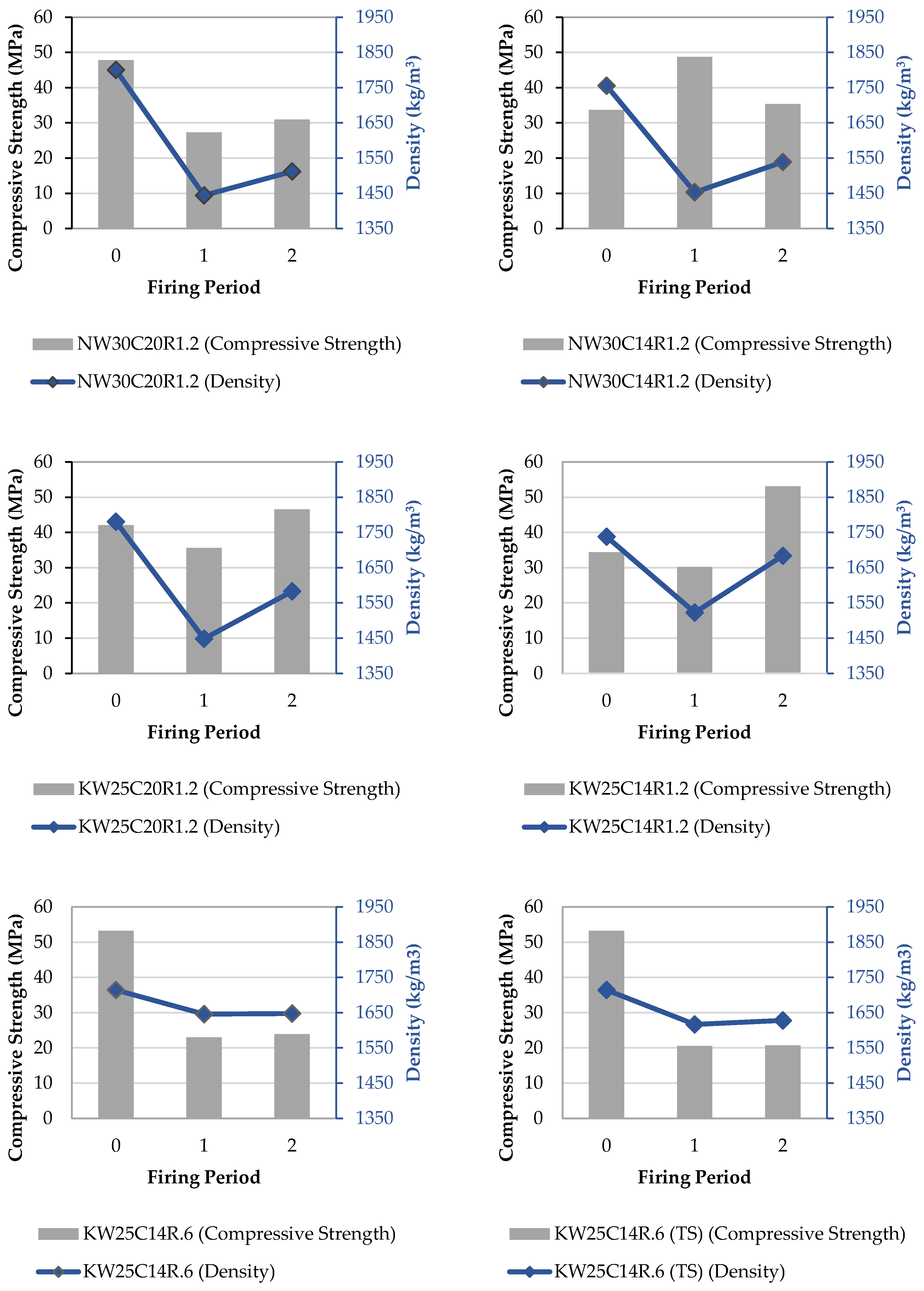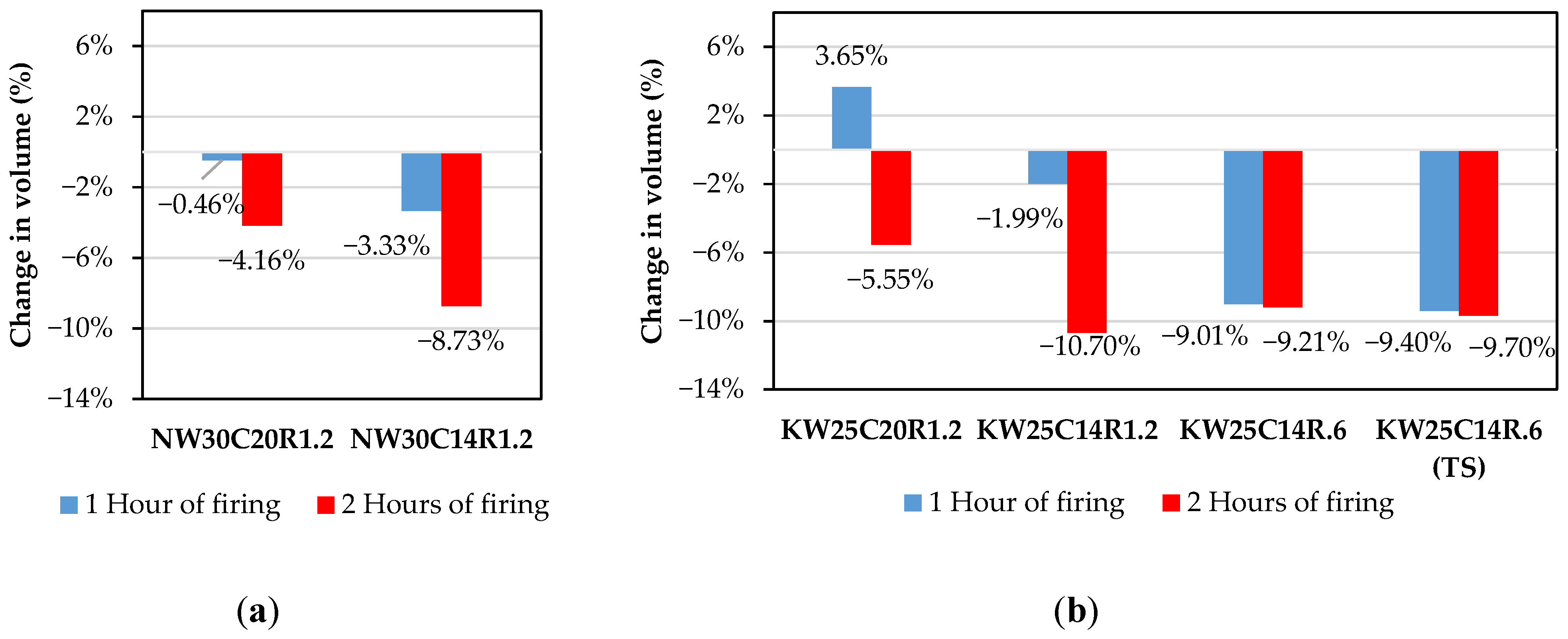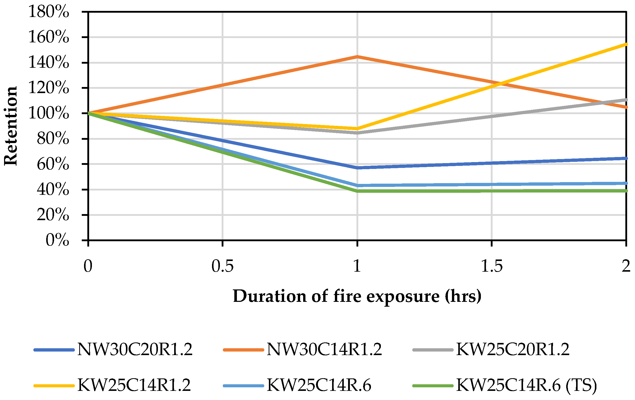 - Potassium-activated geopolymers exhibited approximately 5% lower mass loss compared to their sodium-activated counterparts, which can be attributed to the superior thermal stability and lower mobility of potassium cations. The delayed densification observed in potassium systems resulted in reduced shrinkage during the first hour of firing and the highest retained strength after the second hour (154%). This behaviour is linked to slower geopolymerisation kinetics and the higher melting temperature of potassium. In contrast, sodium-activated mixes demonstrated maximum retained strength at the first hour (145%) and lower shrinkage at the second hour, due to earlier densification and more rapid dehydroxylation.