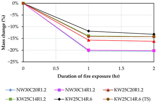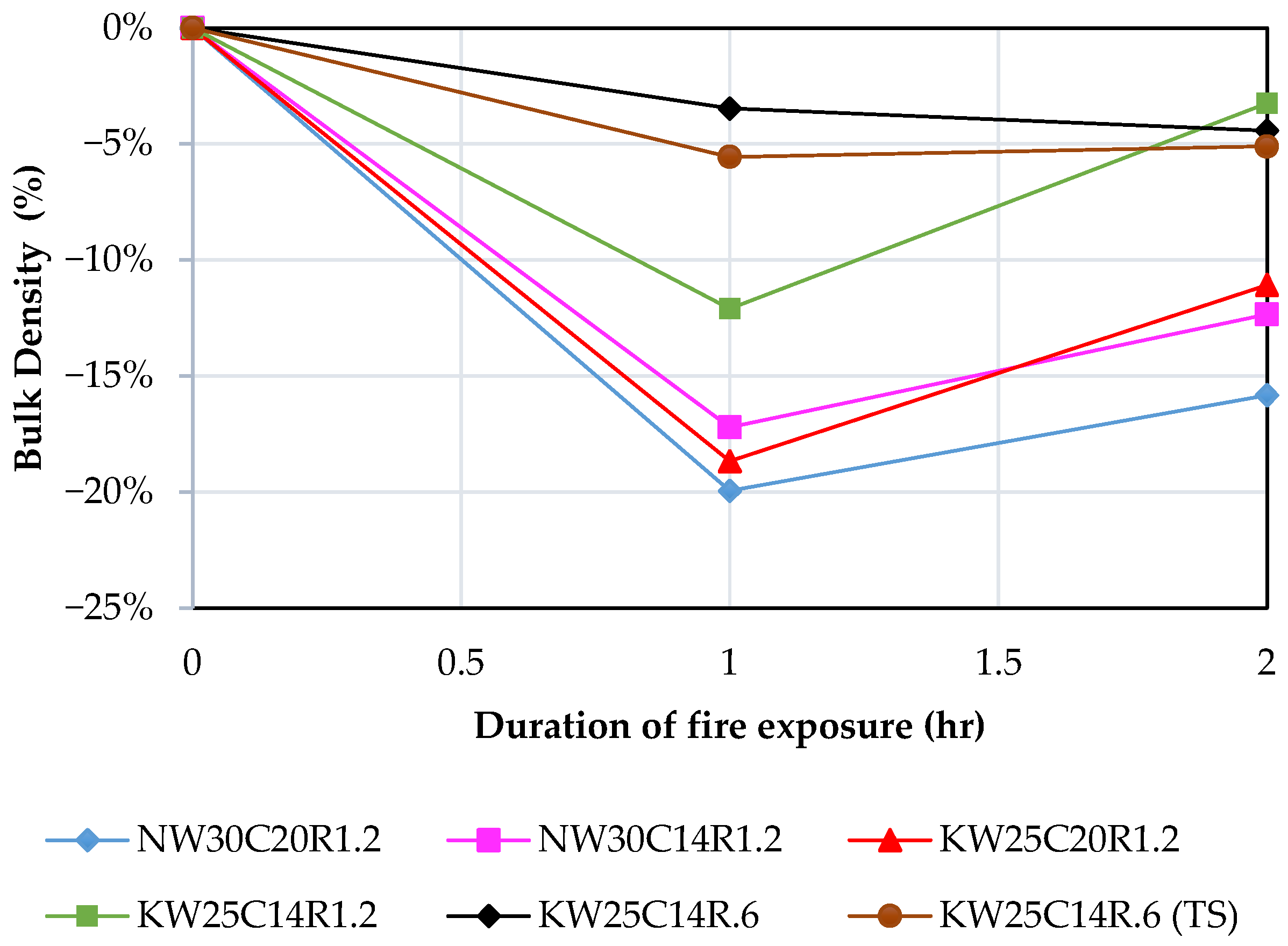 - The rapid heating rates characteristic of ISO 834 fire conditions accelerated moisture release during initial heating to significantly higher rates than those in the literature employing slow heating protocols. This moisture loss resulted in high porosity with large, interconnected voids, reducing density and compressive strength.