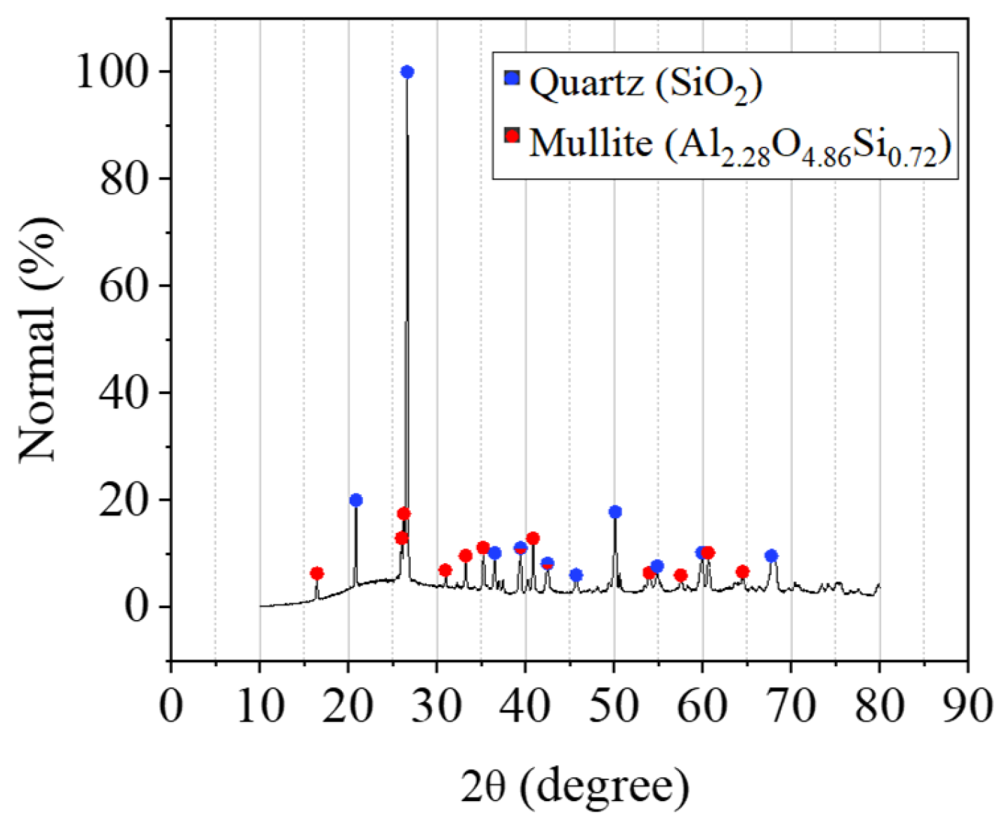 - Ptáček, P.; Křečková, M.; Šoukal, F.; Opravil, T.; Havlica, J.; Brandštetr, J. The kinetics and mechanism of kaolin powder sintering I. The dilatometric CRH study of sinter-crystallization of mullite and cristobalite. Powder Technol. 2012, 232, 24–30. [Google Scholar] [CrossRef]