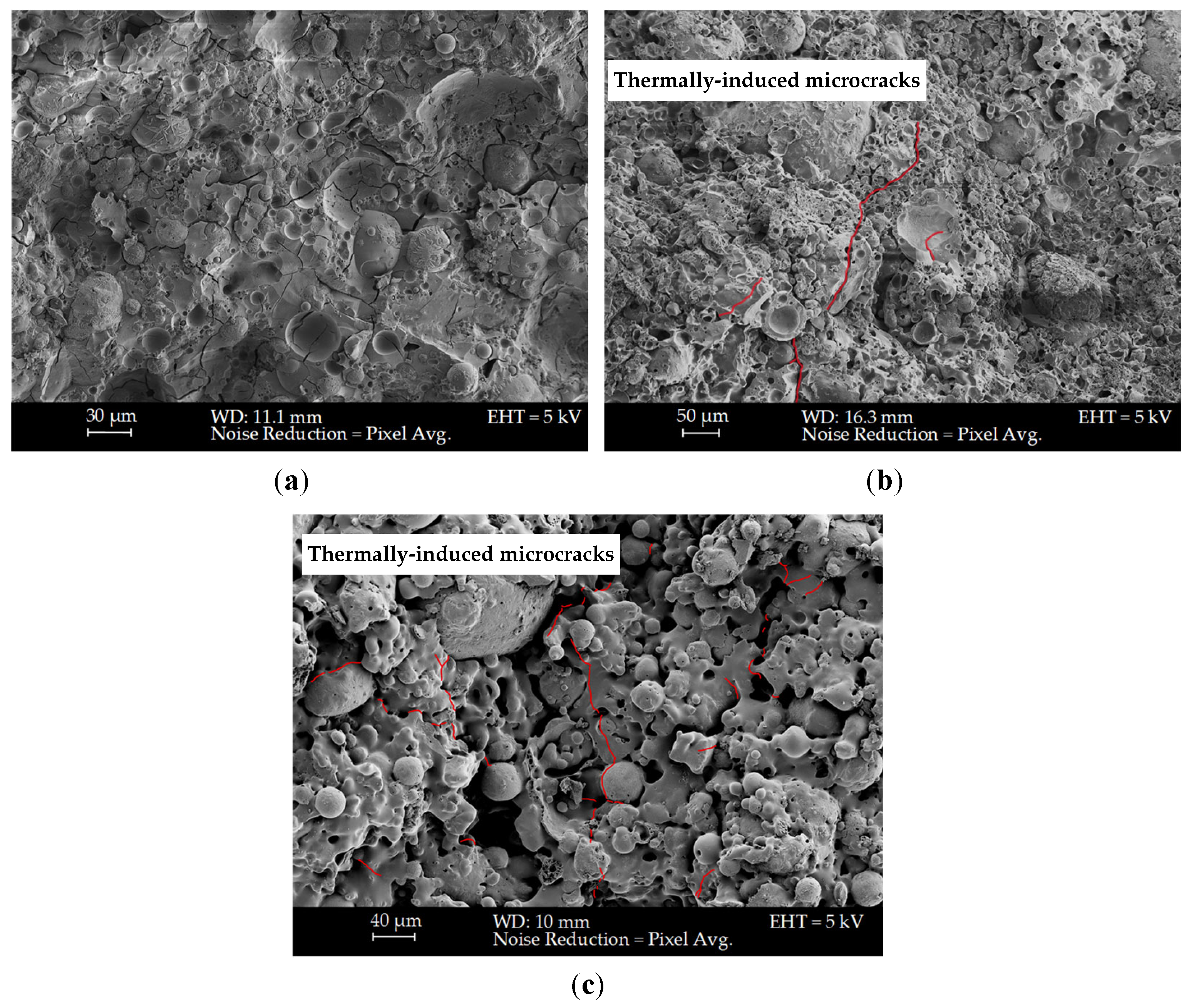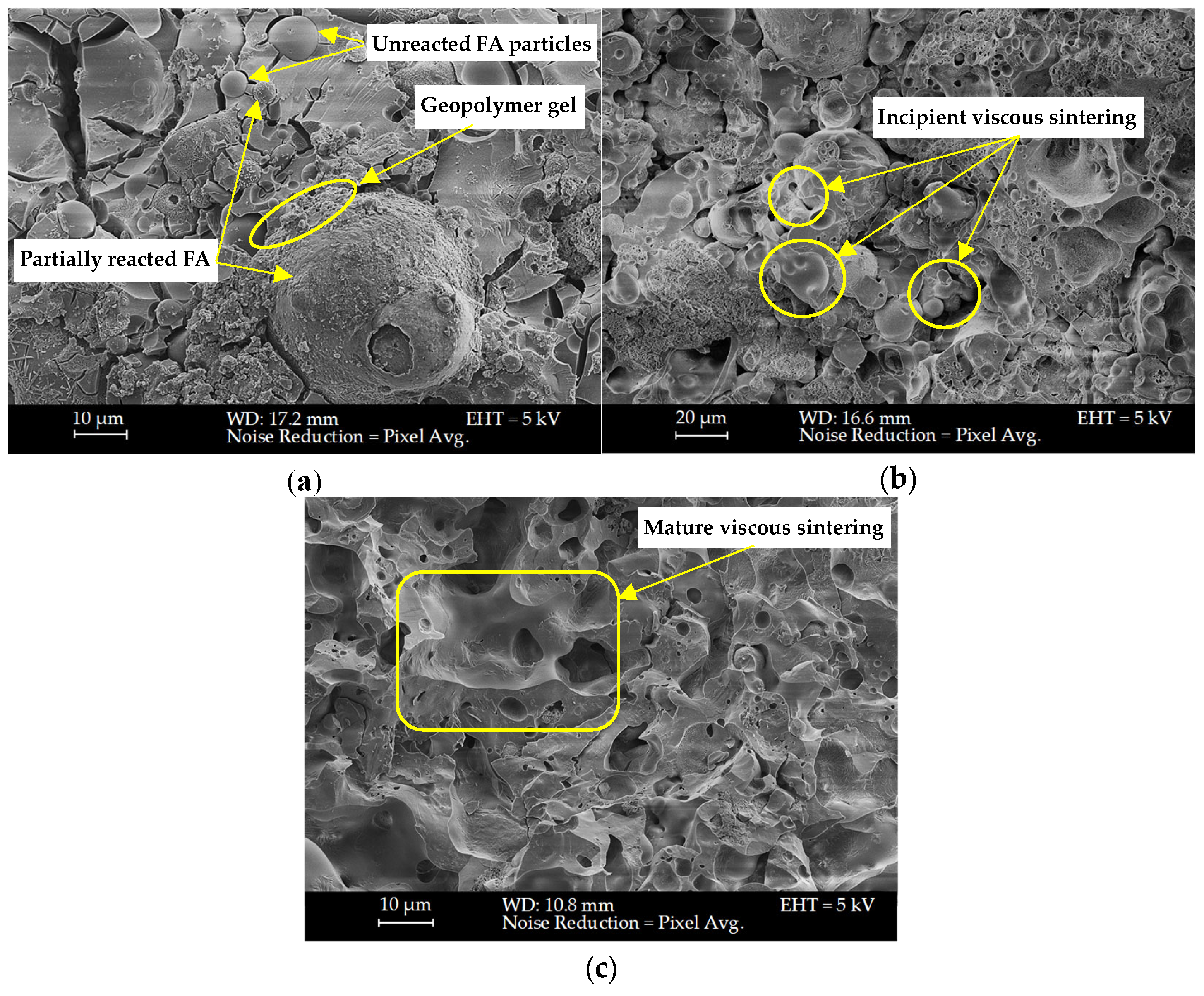 - Across all formulations, irrespective of activator type, exposure to the ISO 834 nominal fire curve revealed a progressive viscous sintering mechanism. During the first initial one-hour heating phase, scanning electron microscopy analysis revealed early-stage melting phenomena and modest consumption of unreacted fly ash particles, indicating incipient sintering activity accompanied by a maximum thermal shrinkage of 9.4%. During the subsequent one-hour heating phase, viscous sintering intensified, resulting in accelerated consumption of unreacted fly ash and enhanced production of additional geopolymer gel. This process facilitated pronounced microstructural densification, manifested by increased thermal shrinkage of 10.7%.