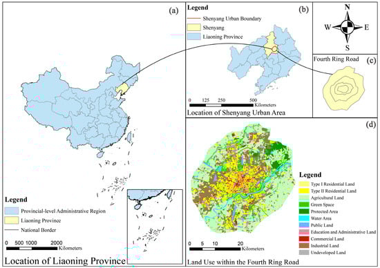 Location map of the study area. (a) The location of Liaoning Province in China; (b) The location of the research area in Liaoning Province; (c) Fourth Ring Road Area of Shenyang City; (d) Land use map of the Fourth Ring Road in Shenyang City.