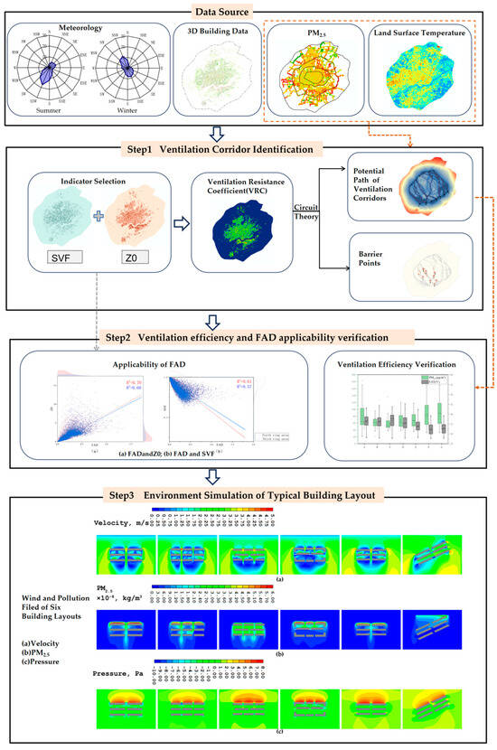 This research aims to measure the effects of ventilation corridors on urban wind-thermal conditions using quantitative methods. Circuit-theoretic modeling was applied to replicate ventilation corridor formation, with the cost path grid and ventilation resistance coefficient (VRC) derived from SVF and roughness length (RL) parameters. Seasonal prevailing wind directions (winter and summer) were employed to determine ventilation corridor paths and simulate airflow barriers. Finally, PM2.5 concentrations and LST served as validation data. The technical roadmap is shown below (Figure 2).
