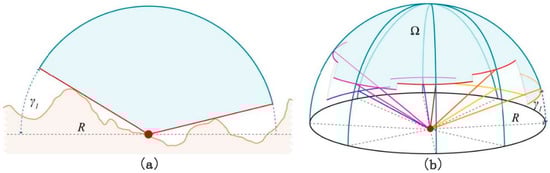 Schematic diagram of SVF [77]. (a) The visible sky proportion (Ω) from a planar view; (b) Computation of the horizon elevation angles () in n directions((eight are presented here) within a search radius R.