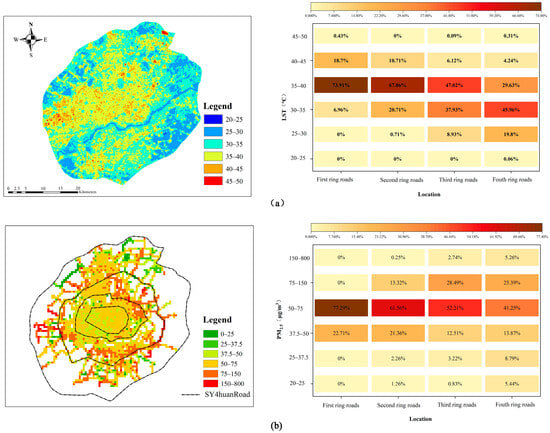 Spatial distribution and statistics of LST and PM2.5. (a) LST; (b) PM2.5.