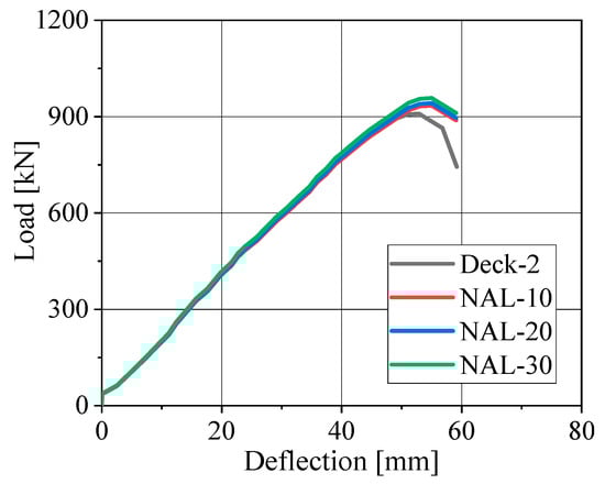 A mesh sensitivity analysis was conducted based on specimen Deck-2 to determine an appropriate global element size for the finite element model. Three global mesh sizes—10 mm, 20 mm, and 30 mm—were selected and denoted as NAL-10, NAL-20, and NAL-30, respectively. Figure 15 presents the simulated load–deflection curves. The results of the NAL-10 and NAL-20 curves were similar and slightly lower than those of the NAL-30 curve. Considering both computational efficiency and analysis accuracy, a global element size of 20 mm was ultimately selected for the finite element model.