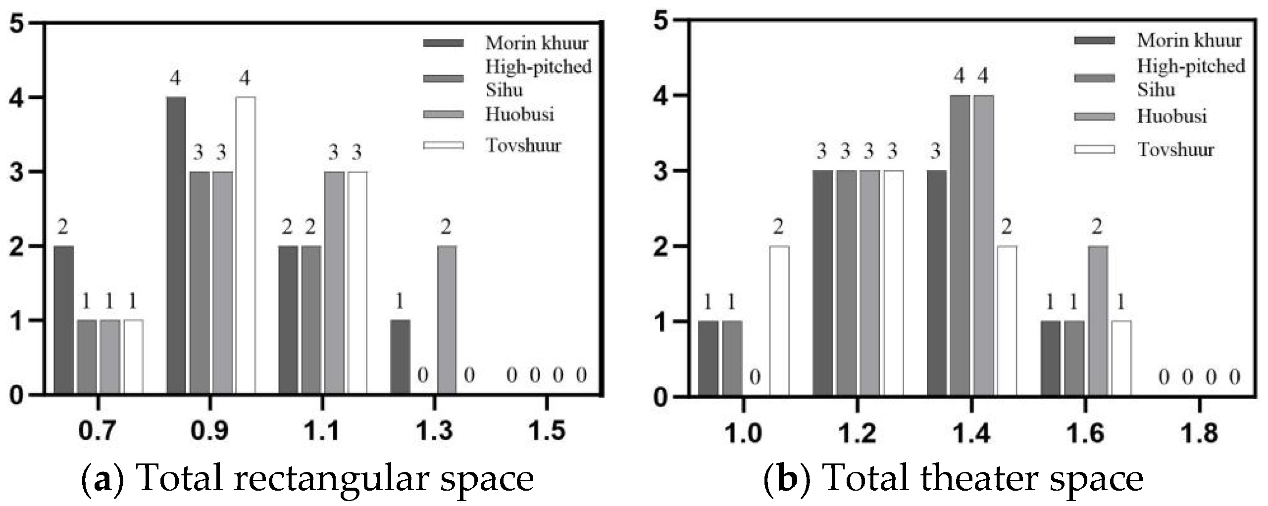 | Rectangular space | Morin khuur | 0.9 s (4), 1.1 s (2), 0.7 s (2), 1.3 s (1) |