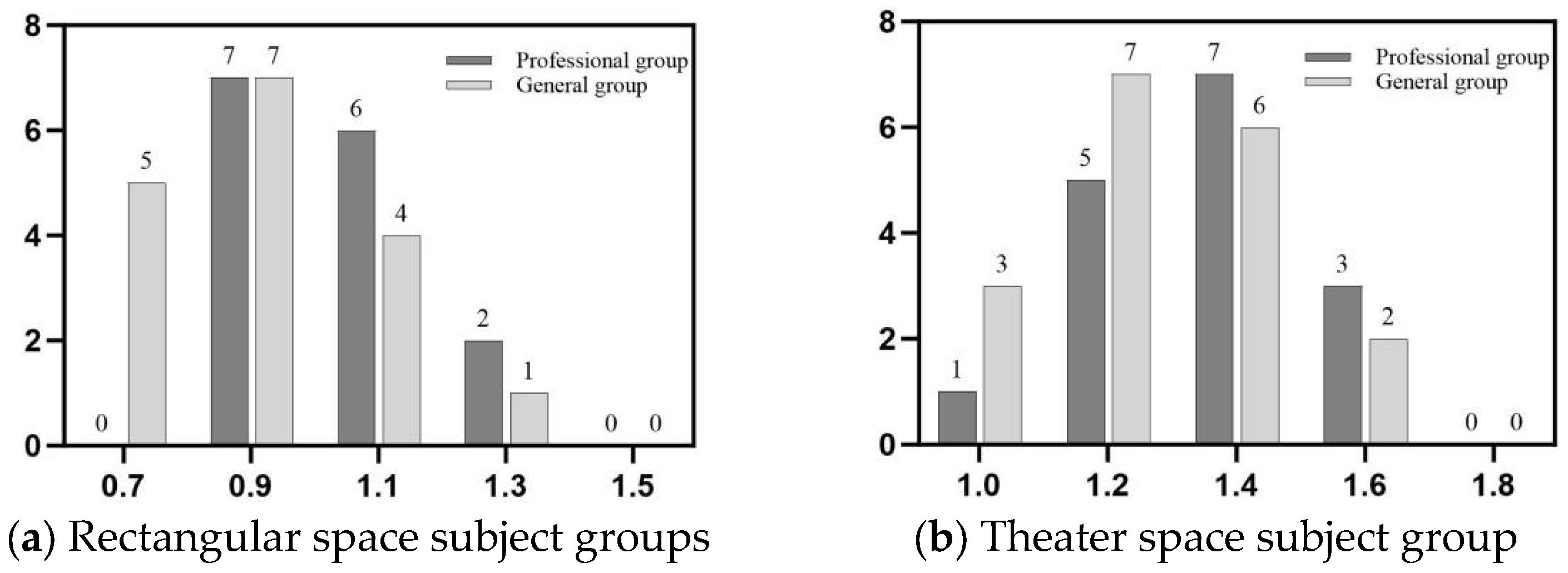 - Regarding the participant group, in the rectangular space, the optimal values for both groups were 0.9 s, while those for the professional and general groups in the theater space were 1.4 s and 1.2 s, respectively. In both spaces, the general group exhibited a larger range of preferred choices, and the professional group demonstrated preferences for higher reverberation.