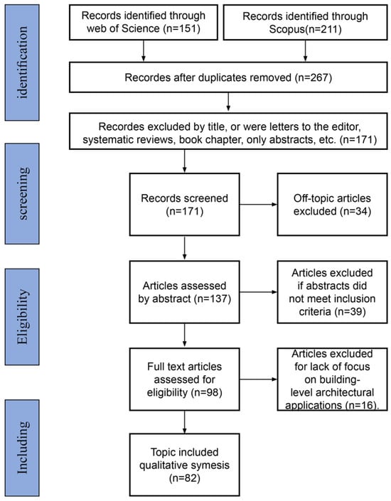Ultimately, 98 articles entered the full-text evaluation stage. During full-text review, 16 articles with an overly strong emphasis on materials science or nano-optoelectronic performance were excluded. Although these articles used keywords such as “BIPV,” their research focus deviated substantially from building performance assessment.