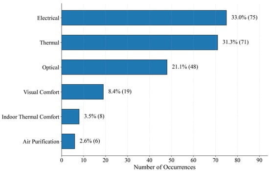 Each topic was synthesized based on the previously coded performance dimensions and research methods, integrating the literature’s quantitative distribution, research strategies, application system types, and temporal characteristics to identify patterns and trends. Through this comprehensive process, six main research themes were identified: thermal performance, electrical performance, optical performance, indoor thermal comfort, visual comfort, and air purification capacity. This thematic categorization not only reflects the primary focal areas in current BIPV research but also provides the structural framework for the literature review in Section 3, enabling the results of this study to be presented in a more systematic and well-organized manner.