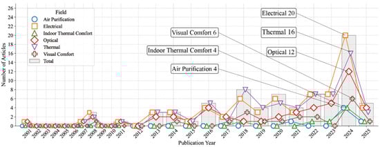 After clarifying these six directions, this study classified and statistically analyzed the 82 articles, and further refined the research scale and development history of each direction. As shown in Figure 2, the research attention to each direction varies significantly. Among them, the research scales of electrical performance (91.5%, 75/82) and thermal performance (86.6%, 71/82) are the largest, indicating that in the past and current stages, the research on BIPV still centers on improving energy efficiency. The research on optical performance is also relatively significant (58.5%, 48/82), reflecting that while focusing on the energy efficiency of buildings, the transparency, optical performance, and other characteristics of photovoltaic materials that are closely related to the visual environment have gradually attracted attention. In contrast, the research proportions of visual comfort (23.2%, 19/82), indoor thermal comfort (9.8%, 8/82), and air purification capacity (7.3%, 6/82), which are directly related to user comfort and health, are relatively low. This indicates that the research on non-energy consumption performance directions is still in the early exploration stage, and architects and researchers’ awareness and attention to human factors and environmental improvement performance need to be further enhanced.
