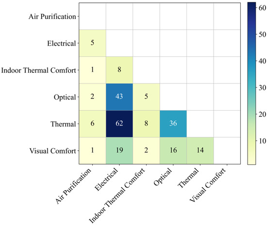 Figure 4 presents a co-occurrence heat map of research directions, revealing the coupling degree among various fields. Among them, the “thermal-electrical-optical” combination is highly integrated, indicating that BIPV research is typically a composite system study; the coupling between “optical” and “visual comfort”, and between “thermal” and “thermal comfort” is also very obvious, demonstrating that human factors have been embedded in system design; while “air purification” is weak, it still has connections with mainstream technical directions and has expansion potential.