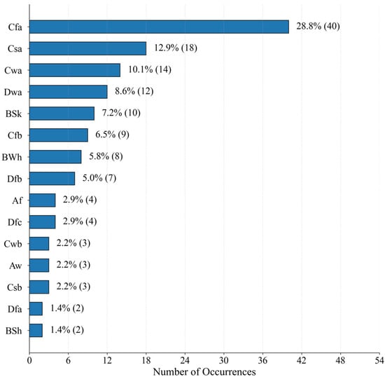 Following this, Csa (Mediterranean climate: dry and hot summer, mild and humid winter) and Cwa (humid subtropical with dry winter and hot summer) represent 12.9% (n = 18) and 10.1% (n = 14) of the cases, respectively. These are primarily located in Mediterranean coastal areas and central China (e.g., the middle Yangtze River basin). Other climate zones of note include Dwa (humid continental with dry winters and hot summers), BSk (cold semi-arid), and Cfb (temperate oceanic), suggesting a growing diversification in research locations.