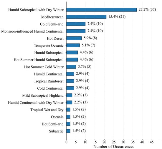 Under the applied climate classification system (Figure 7), the most common category is “Humid Subtropical with Dry Winter”, accounting for 27.2% (n = 37), which broadly corresponds to the Cfa and Cwa classifications in the Köppen system. The next most frequent types are “Mediterranean” (15.4%, n = 21) and “Monsoon-Influenced Humid Continental” (7.4%, n = 10). Additionally, less frequent categories such as “Hot Desert”, “Temperate Oceanic”, and “Tropical Rainforest” were also identified, indicating that BIPV research is gradually extending into diverse and climatically challenging environments.