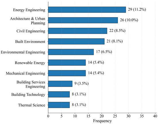 In total, over 40 distinct disciplinary categories were identified. As illustrated in Figure 8, the top ten most frequently occurring fields are presented. Among them, Energy Engineering and Architecture & Urban Planning were the most prevalent, accounting for 11.2% and 10.0% of the total sample, respectively. Other prominent disciplines included Civil Engineering (9.6%), Built Environment (8.9%), and Environmental Engineering (7.4%). These findings underscore the central role of interdisciplinary collaboration—particularly among architecture, energy, and environmental disciplines—in advancing BIPV research.