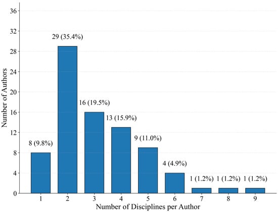 Furthermore, we analyzed the number of distinct research domains associated with each author, as shown in Figure 9. The data indicate that 33.3% of authors were affiliated with two disciplines, 28.4% with three, and 21.0% focused on a single discipline. Notably, 17.3% of authors had cross-disciplinary affiliations spanning four or more fields. This distribution reveals a strong trend toward multidisciplinary integration among BIPV researchers, which provides a solid theoretical and technical foundation for addressing challenges related to functional integration, energy efficiency optimization, and environmental adaptability in building-integrated photovoltaic systems.