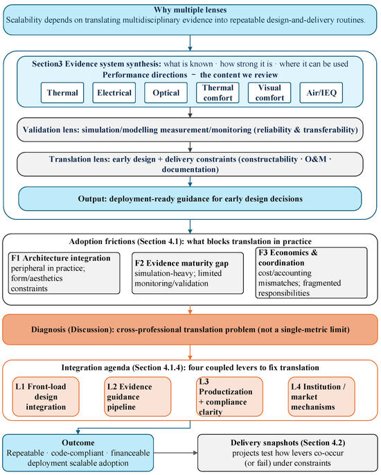 From a building-design perspective, scalability is often determined in early-stage design, when project teams set overall building form, envelope-integration strategies, and performance priorities. Yet the evidence needed for these decisions is dispersed across disciplinary silos and typically reported as isolated performance results (e.g., thermal, electrical, or daylighting), rather than synthesized into design-relevant guidance that can be implemented within routine project workflows. This design–evidence disconnect helps explain why BIPV remains underutilized despite its recognized technical potential.