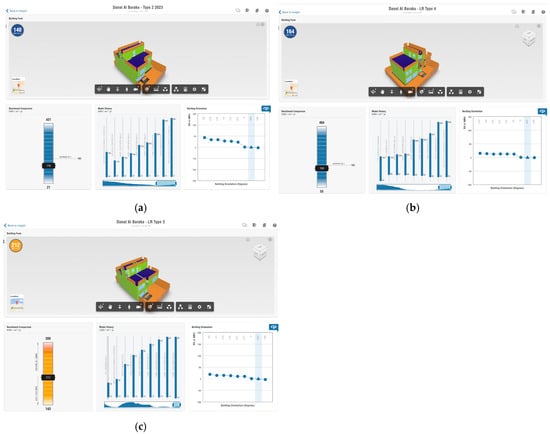 Energy analysis of study cases after structural system optimization. (a) Case study 3 achieved 186 KWh/m2·yr. (b) Case study 3 achieved 186 KWh/m2·yr. (c) Case study 2 achieved 264 KWh/m2·yr.