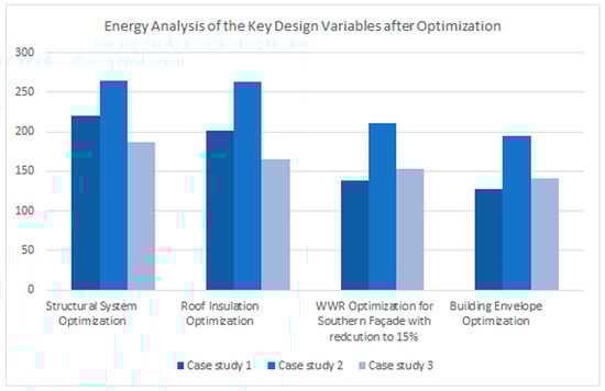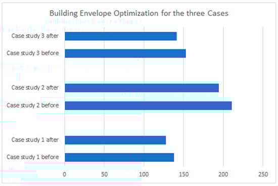 The energy analysis results after optimization were recorded as follows: 128 kWh/m2·y for case study 1, representing 7.39% energy reduction; 141 kWh/m2·yr for case study 3, representing 13.5% energy reduction; and 194 kWh/m2·yr for case study 2, representing 7.93% energy reduction. See Figure 8.