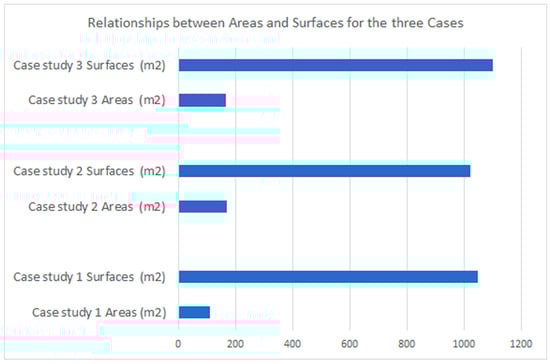 For the three study cases, Figure 10 shows the relationship between their spaces and surfaces, Supplementary S4. In cases 2 and 3, which have areas that are similar, case 3’s 7.62% larger surfaces led to less energy reduction. Case study 3 achieved 26.94%, while case study 2 achieved 34.81%. Case study 1 achieved the largest percentage of energy reduction, 48.39%, while having the smallest area.