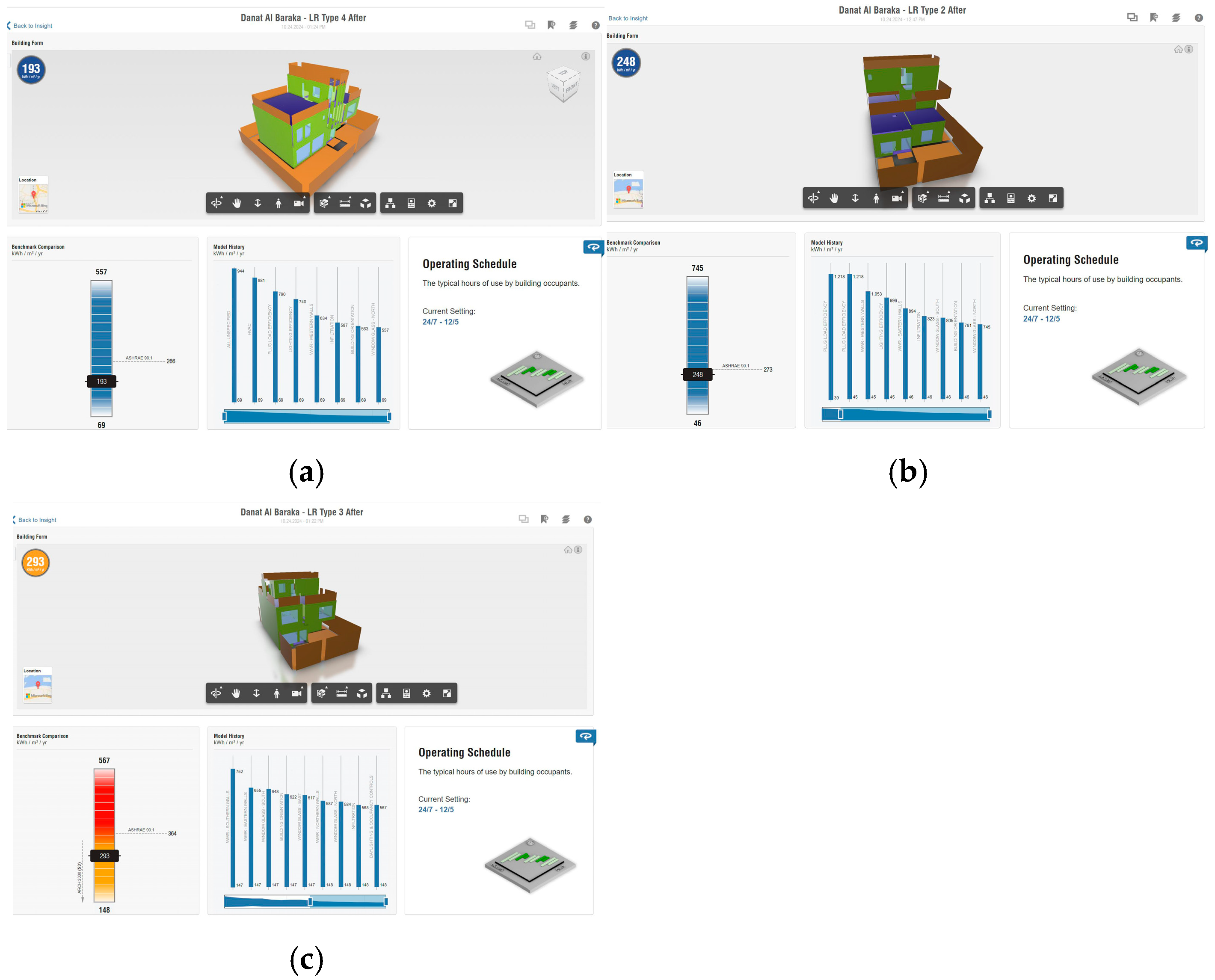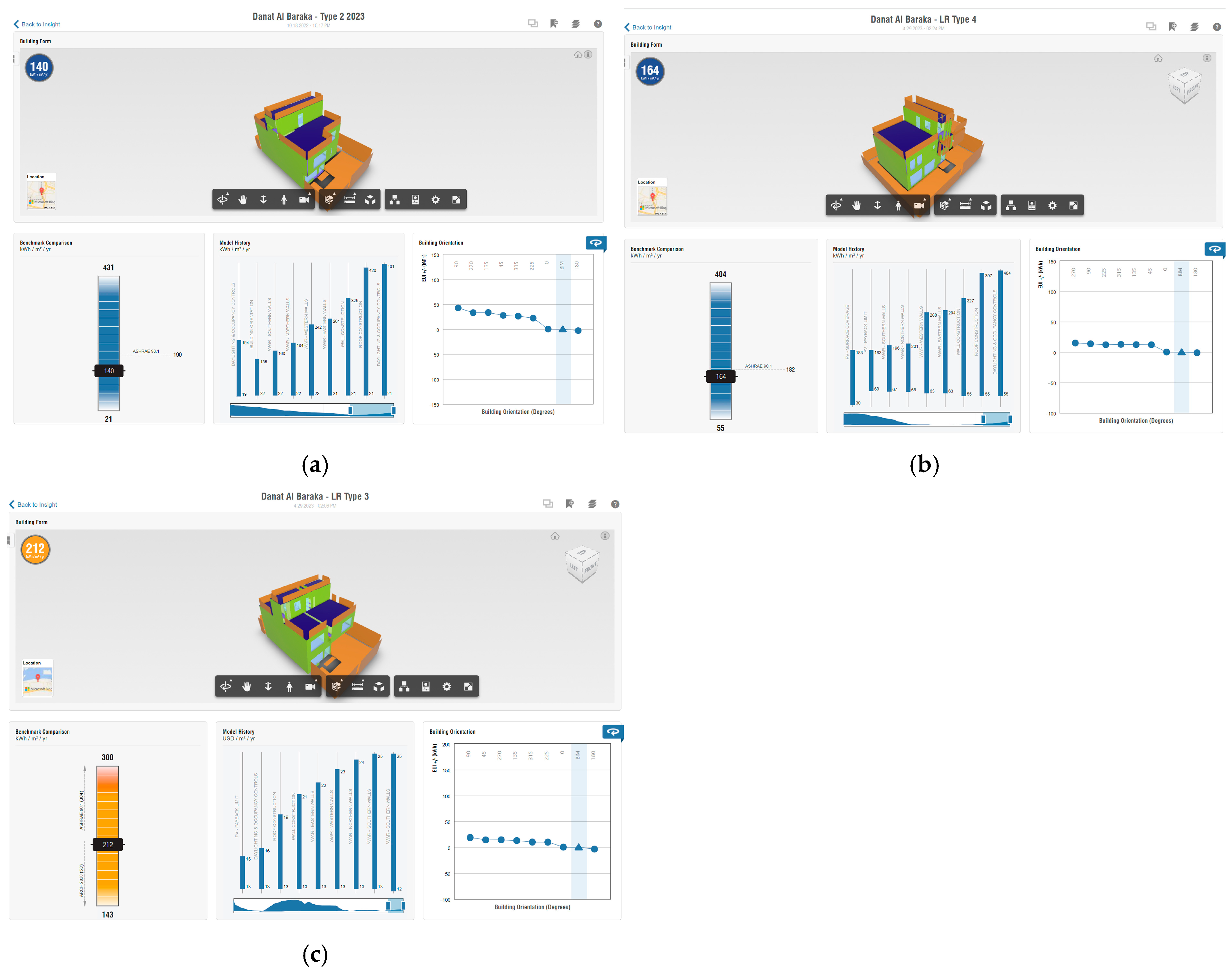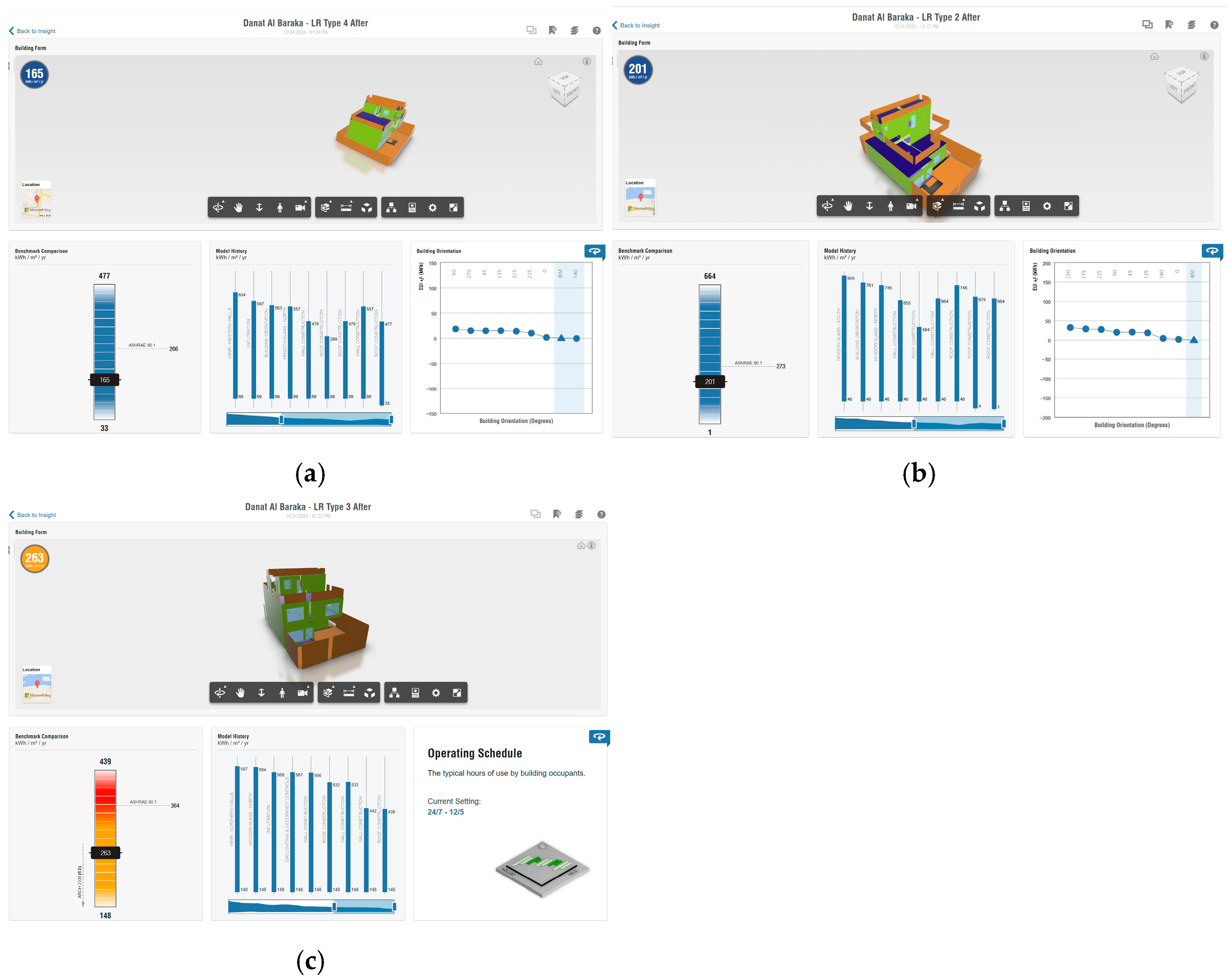 The output values from the previous energy optimization processes were recorded for all three study cases as follows: case study 1 (138 KWh/m2·yr), case study 3 (163 KWh/m2·yr), and case study 2 (211 KWh/m2·yr). These data serve as the baseline for comparison against the post-optimization results.