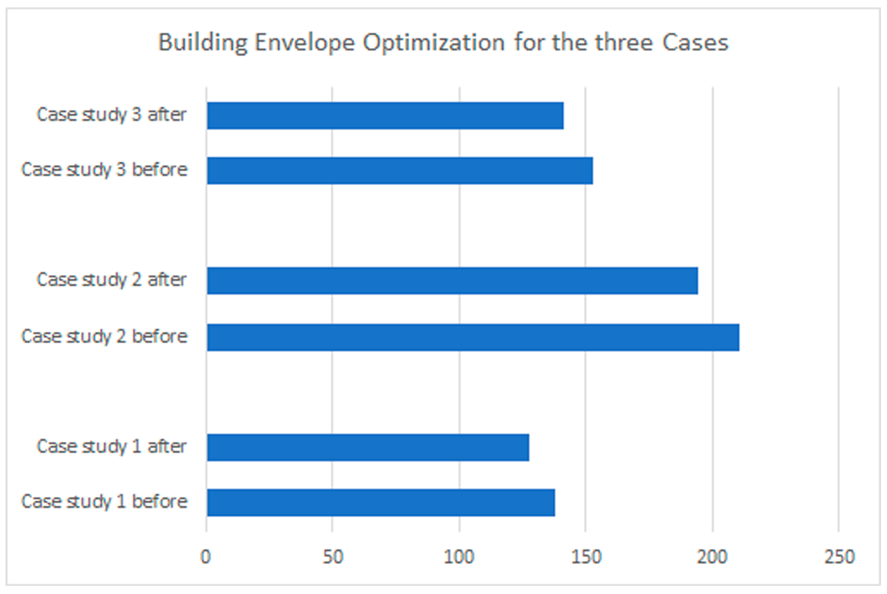 Although case study 3 demonstrated the best baseline energy performance, case study 1 exhibited the most significant energy reduction potential after optimization, achieving a 3.37% decrease. This was followed by a 1.79% reduction for case study 3 and a 0.75% reduction for case study 2,