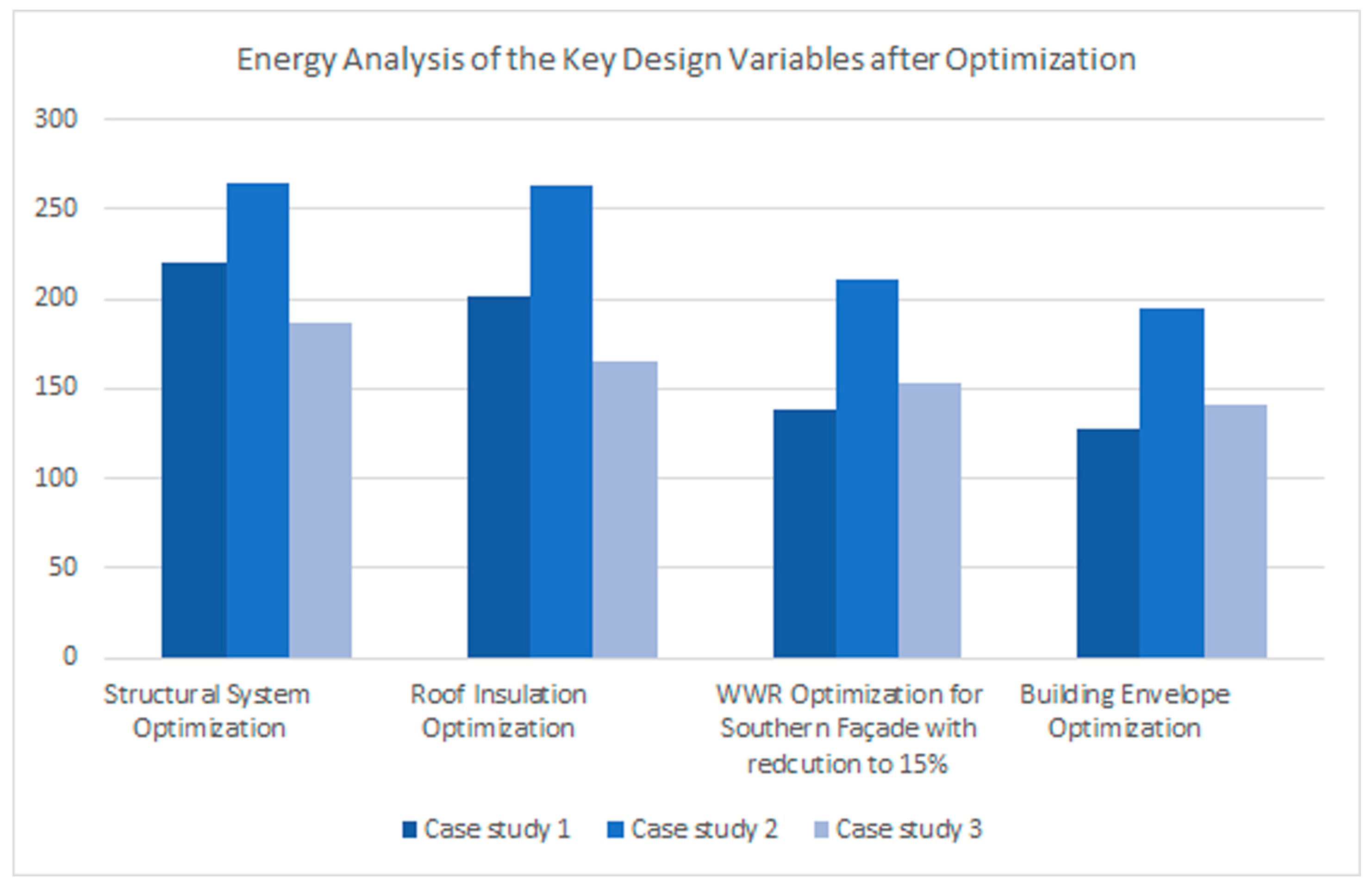 A clear trend emerges from these results: the optimization process for each design variable consistently contributes to energy reduction by a certain percentage. This reduction percentage remains similar across all three cases throughout the optimization process. When comparing the difference in overall energy reduction among the three cases, case 1 achieved the highest savings, followed by case 3, with case 2 showing the lowest reduction.