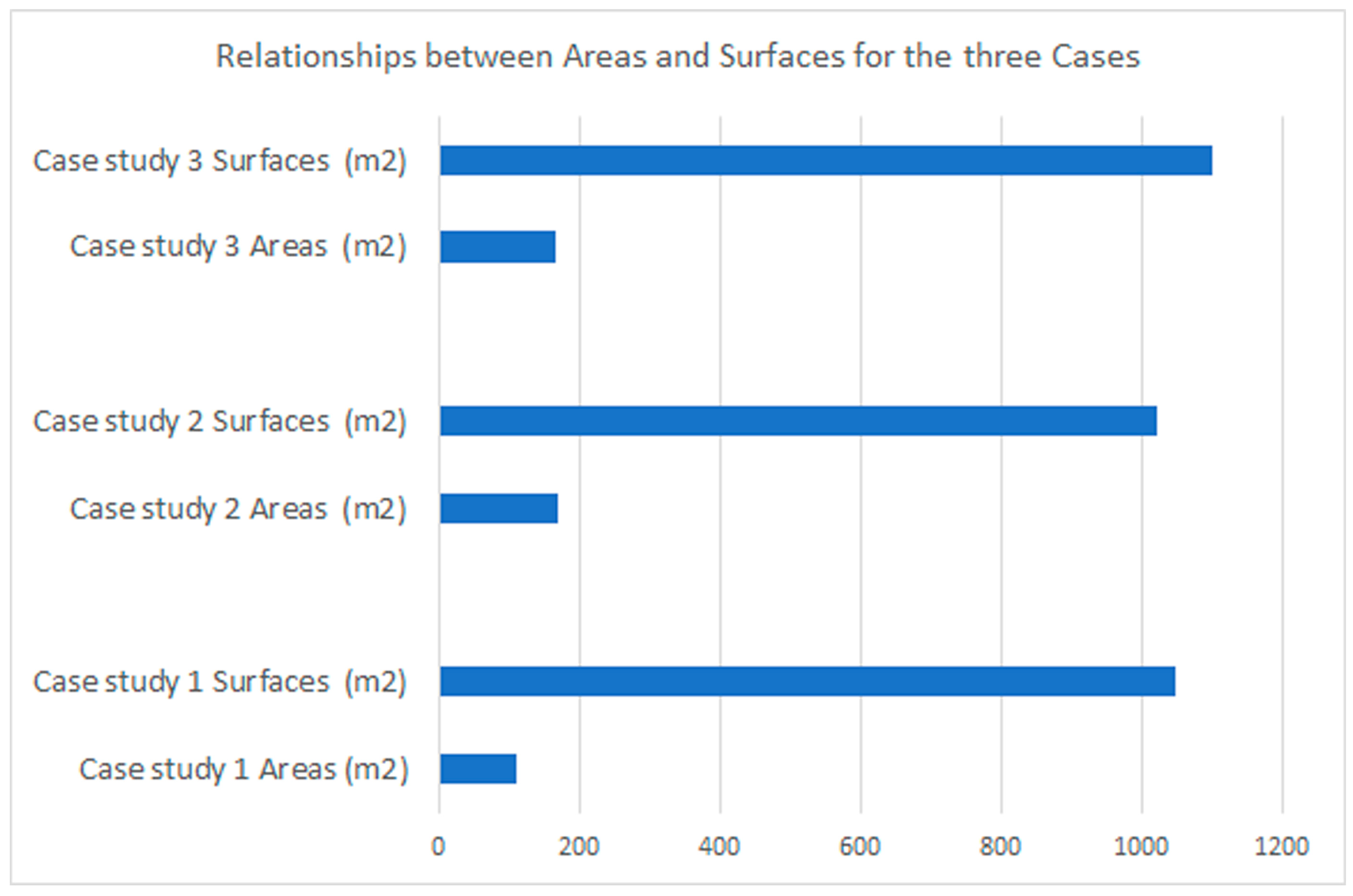 Supplementary S4. In cases 2 and 3, which have areas that are similar, case 3’s 7.62% larger surfaces led to less energy reduction. Case study 3 achieved 26.94%, while case study 2 achieved 34.81%. Case study 1 achieved the largest percentage of energy reduction, 48.39%, while having the smallest area.