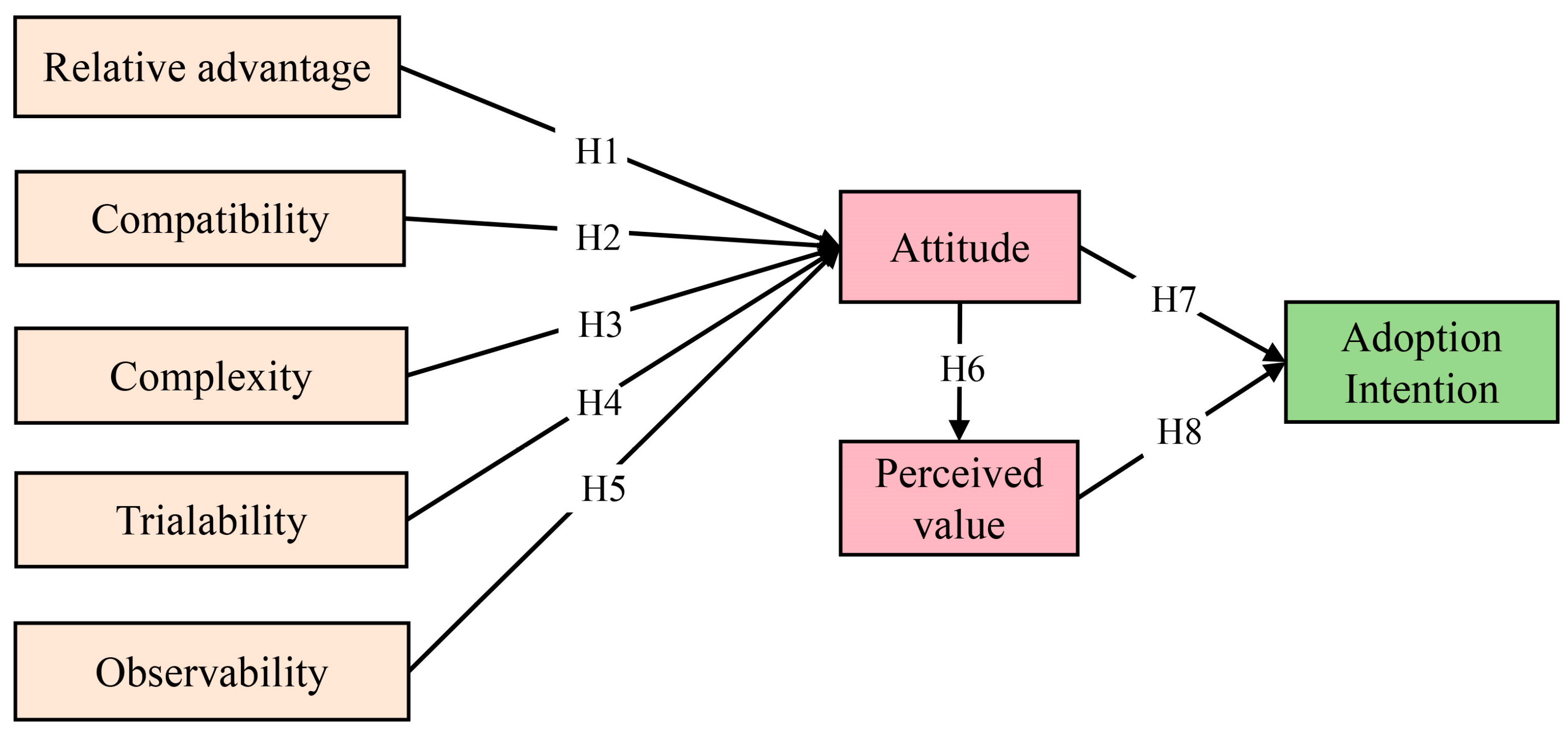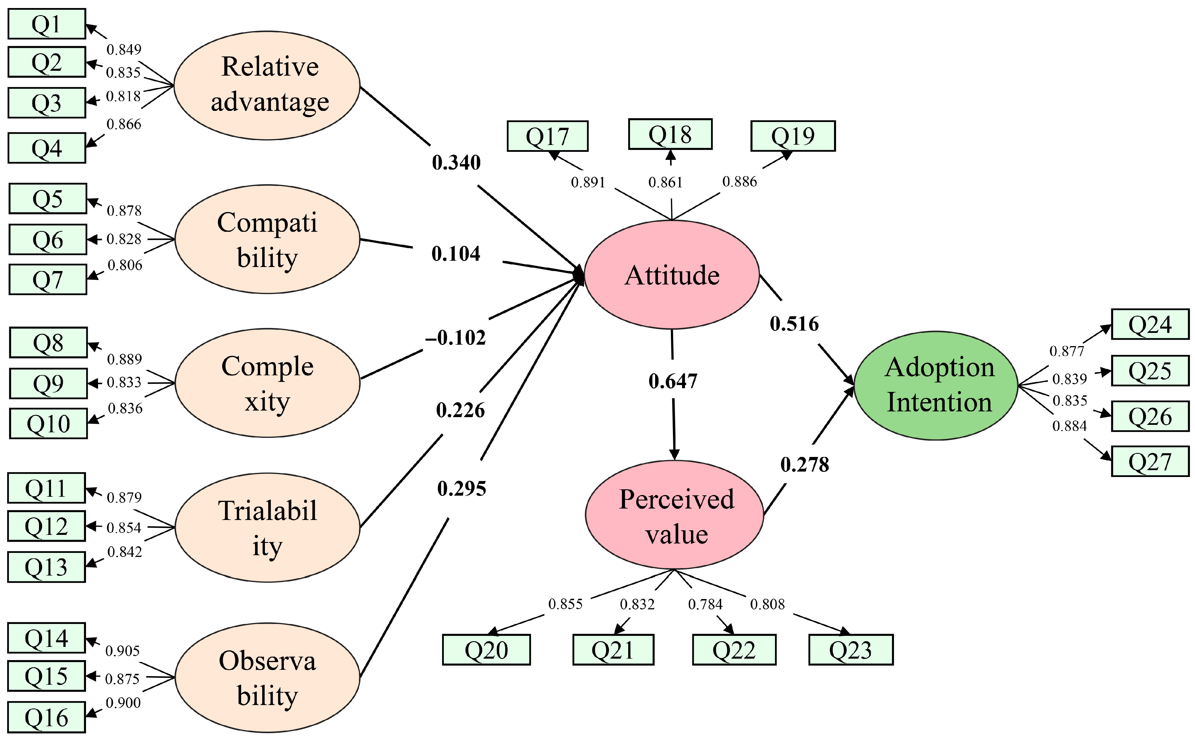 | Relative Advantage | Compatibility | Complexity | Trialability | Observability | Attitude | Perceived Value | Adoption Intention | |