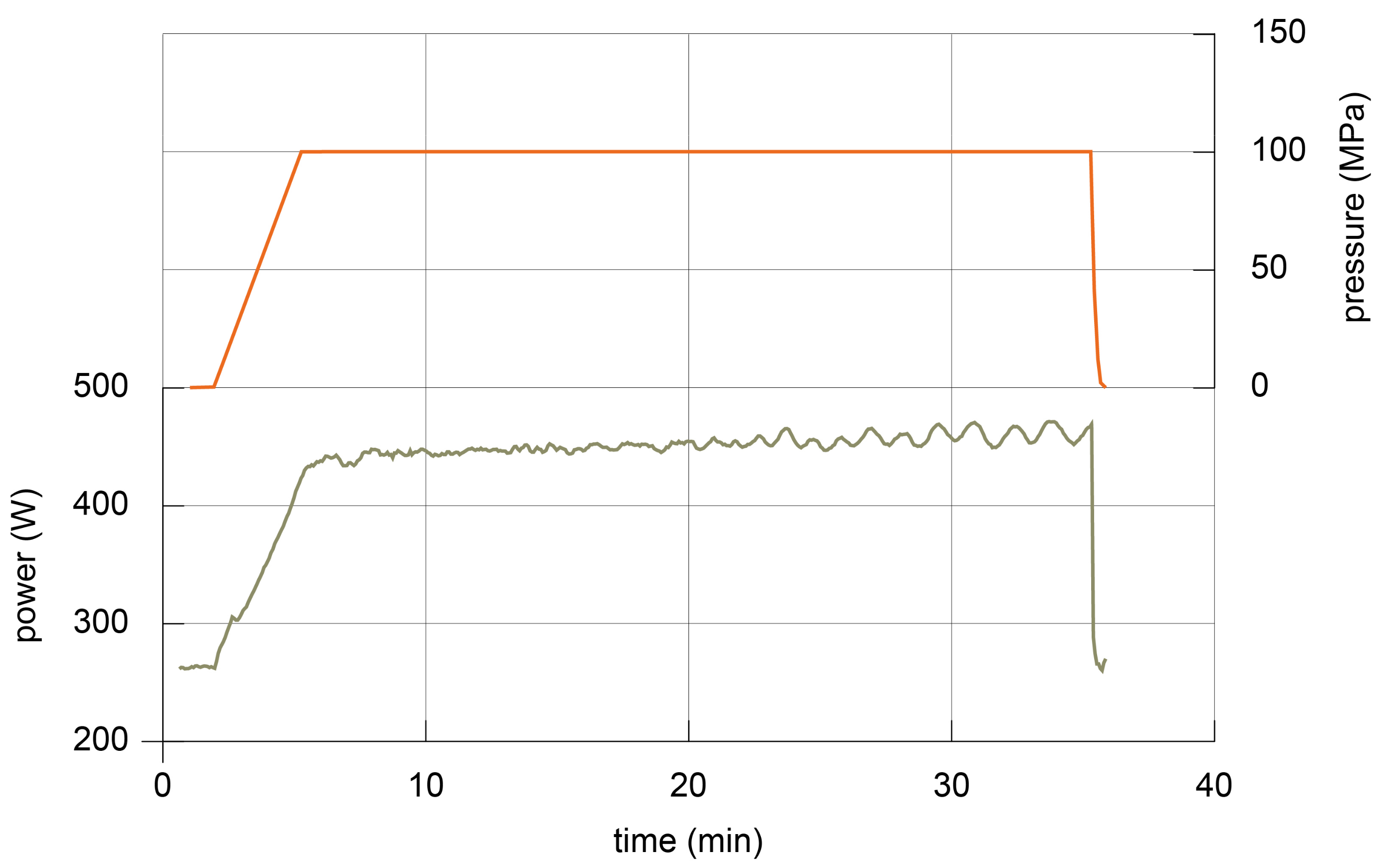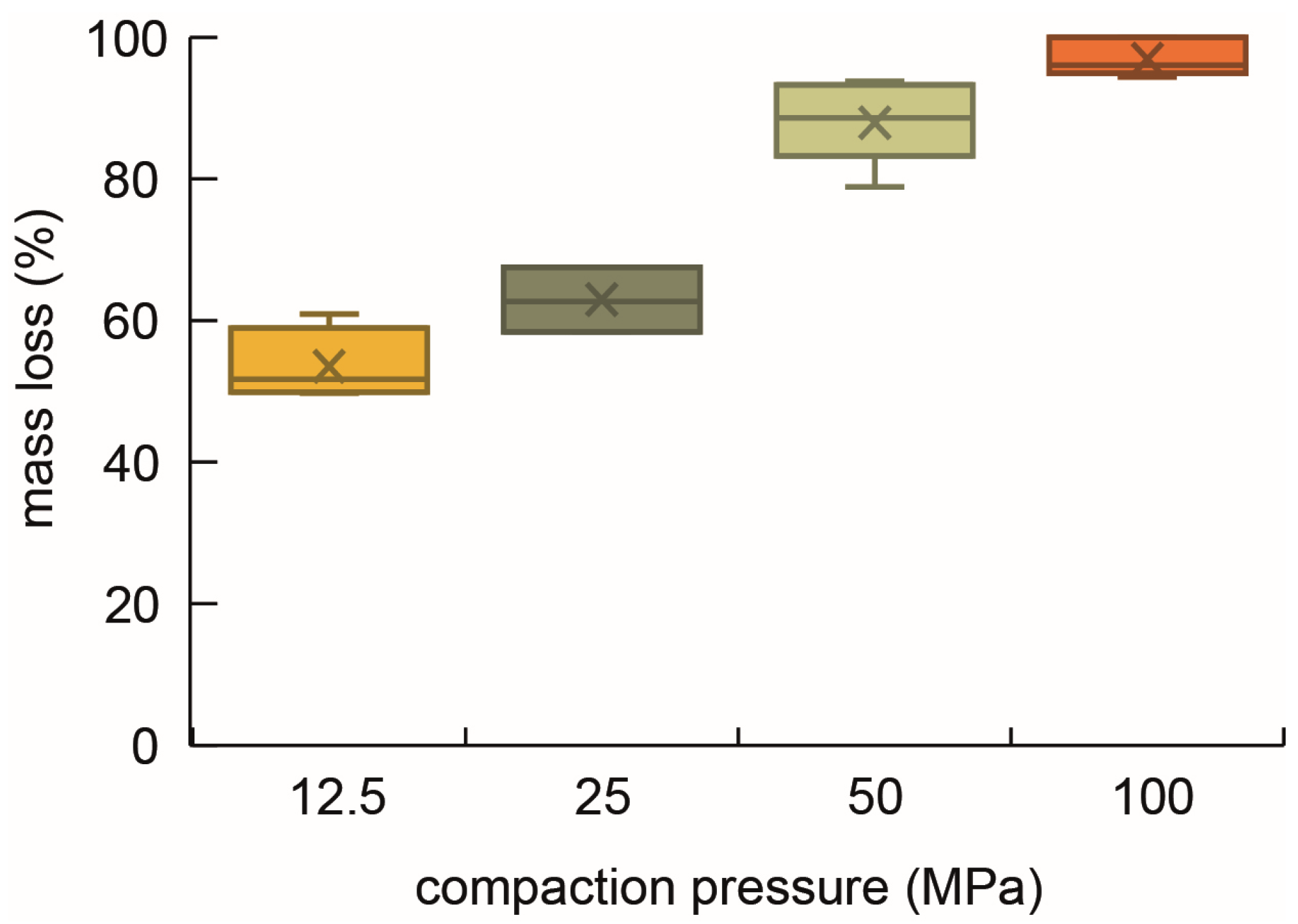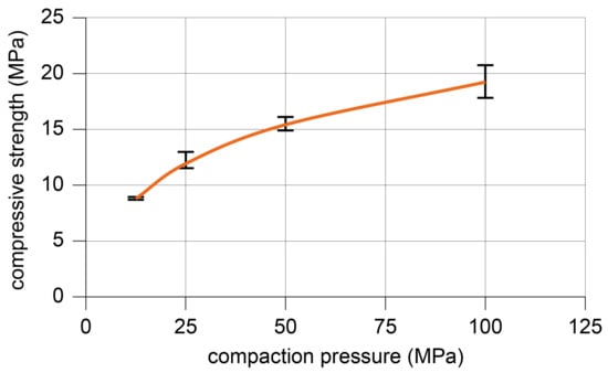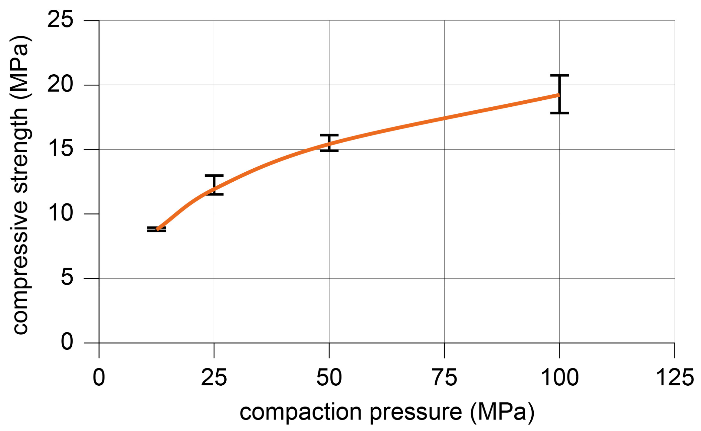 - Within the scope of this study, a consolidation time of 3 min was found to be most effective in terms of compressive strength, as a substantial part of the consolidation had already occurred by then. The specimens that were compacted for 3 min at 100 MPa achieved a compressive strength of 17.6 MPa.