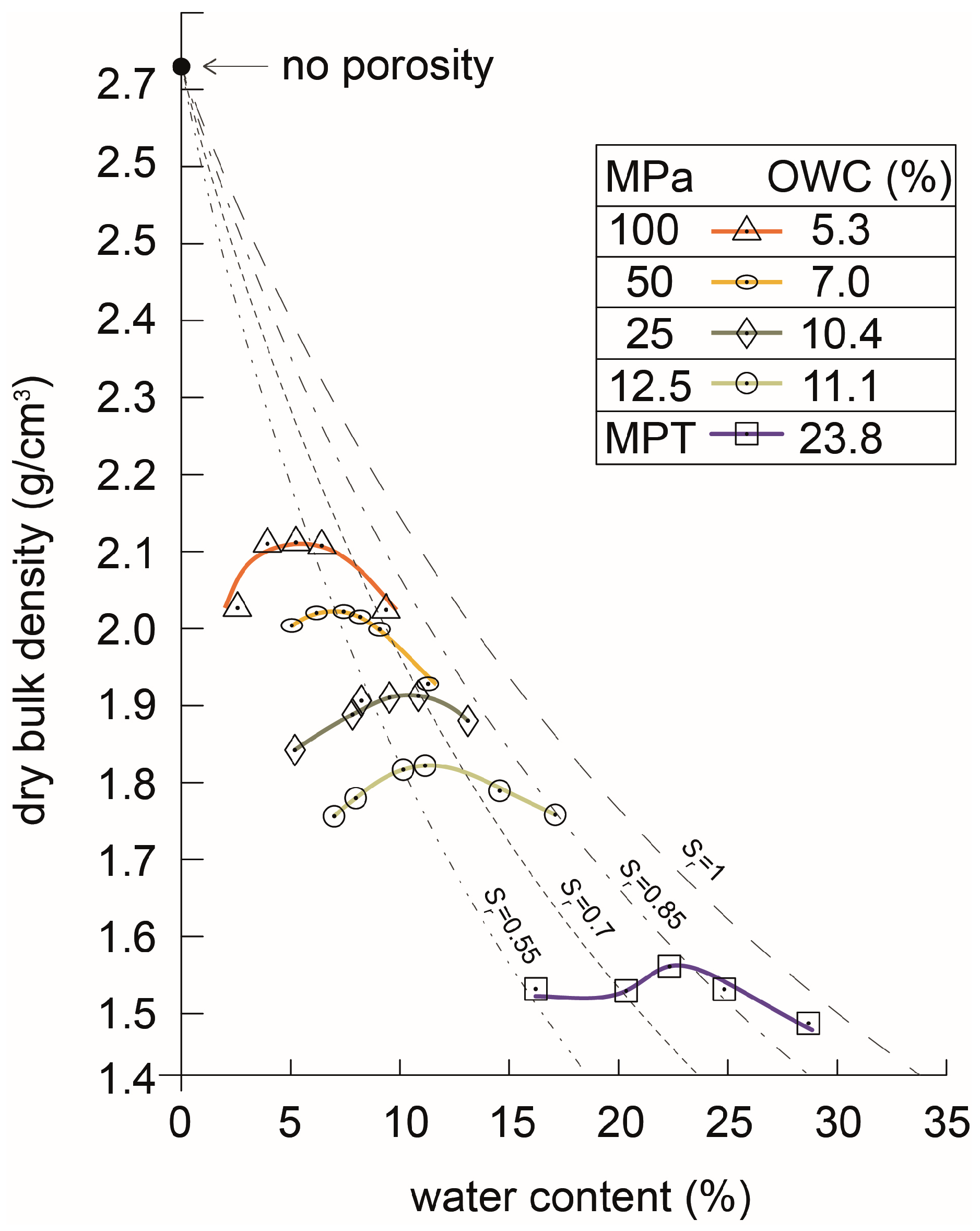 - However, improved water durability has been associated with higher water content during compaction. At the same time, the higher MWC resulted in an uneven water distribution, potentially leading to a heterogeneous porosity within the compact. Future research should explore these relationships in greater depth, with emphasis on more efficient drainage during compaction.