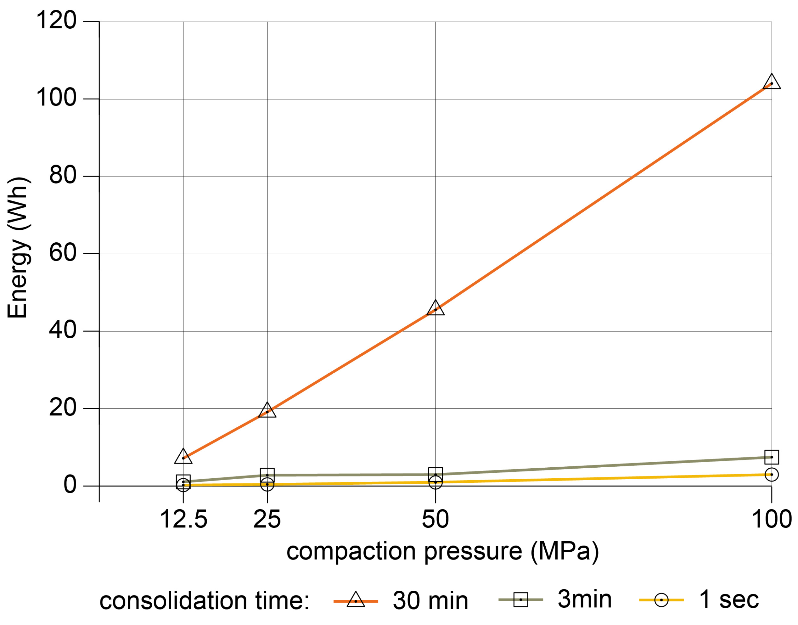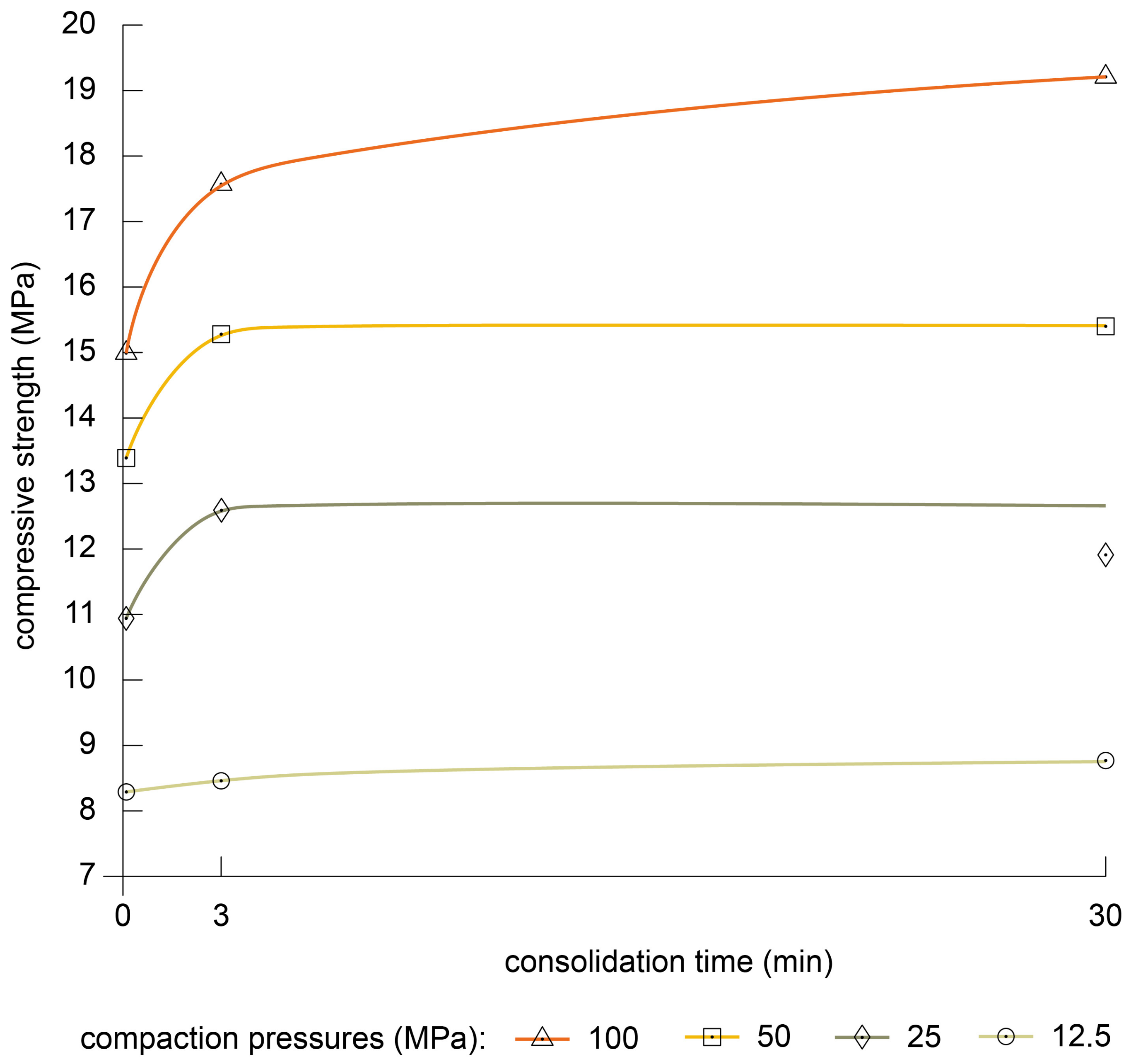 - Furthermore, longer consolidation times are beneficial for reaching greater strength, particularly at higher compaction pressures. However, long consolidation times may hinder industrial production, making the increase in the pressure more feasible.