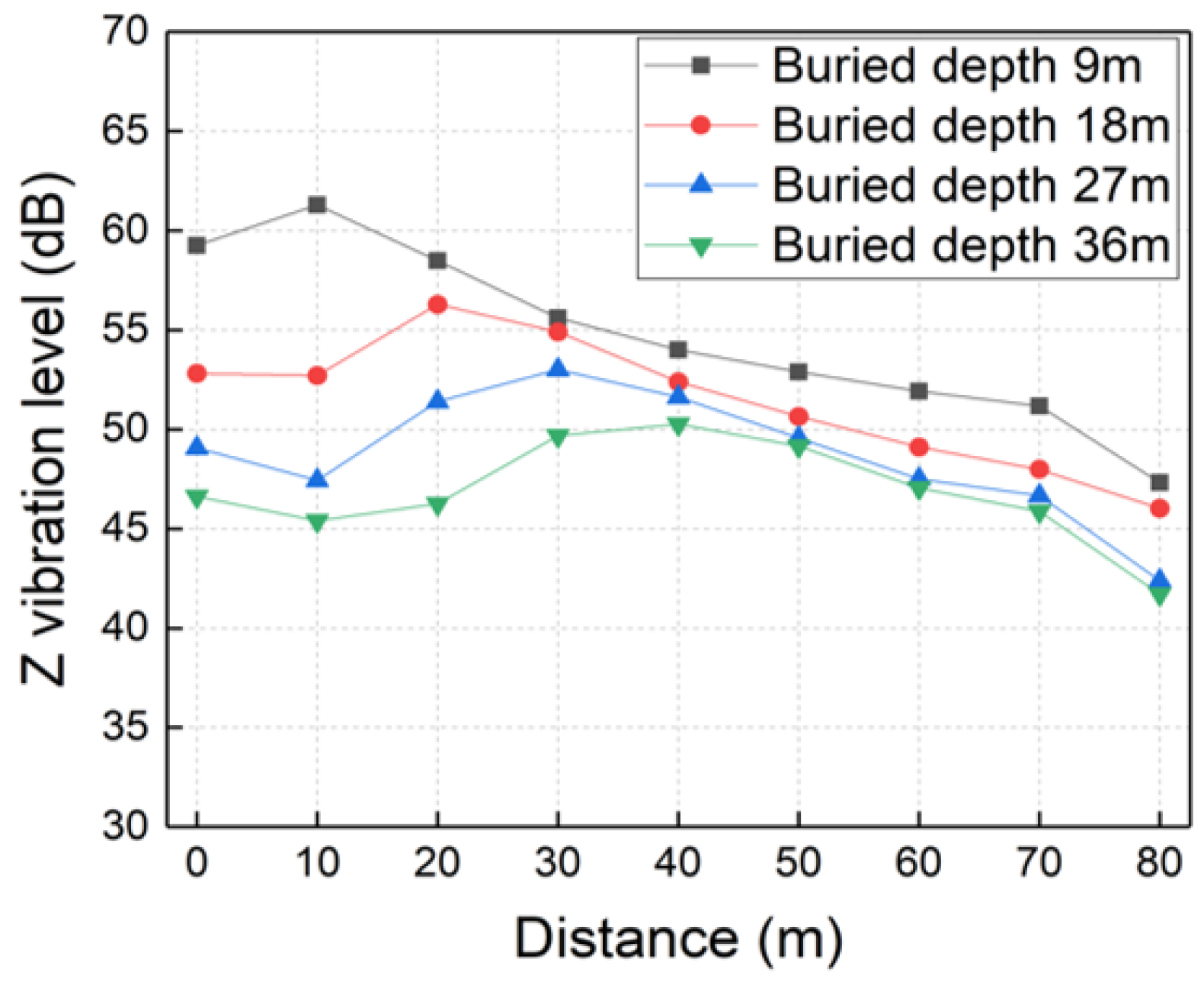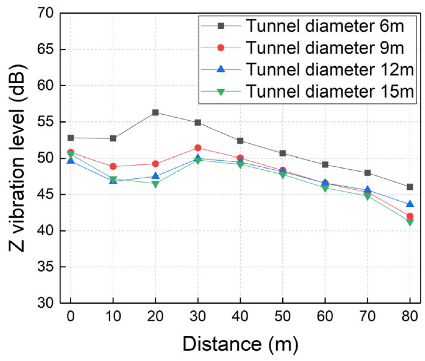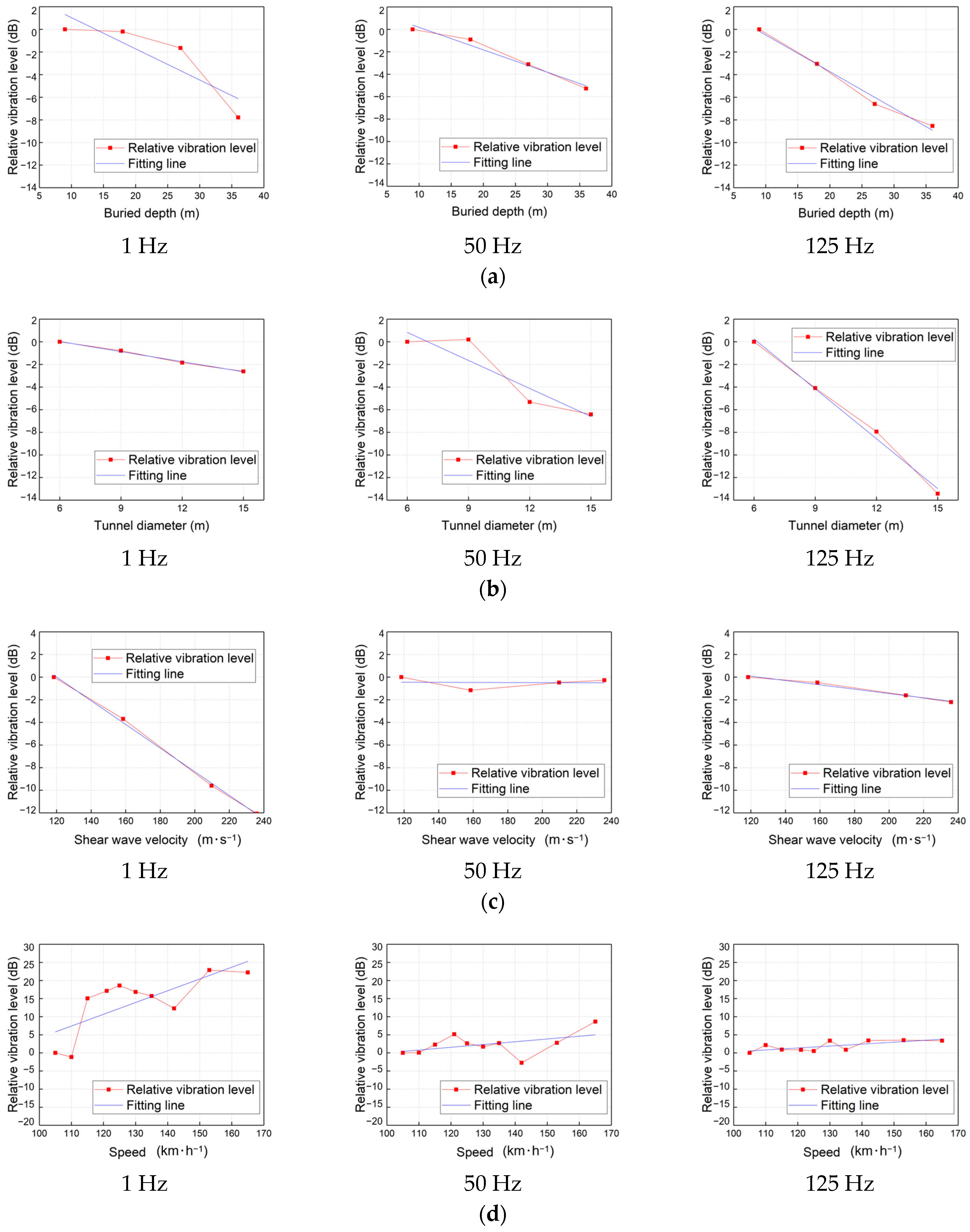 - Ground vibration levels generally decrease with increasing tunnel burial depth, tunnel diameter, and soil shear wave velocity, while increasing linearly with train speed. Distinct vibration amplification zones are observed at specific distances correlated with burial depth and diameter. Furthermore, increasing the tunnel diameter yields the most significant mitigation benefits for smaller tunnels (6 m–9 m), and improving soil stiffness is particularly dominant in reducing near-field vibrations.