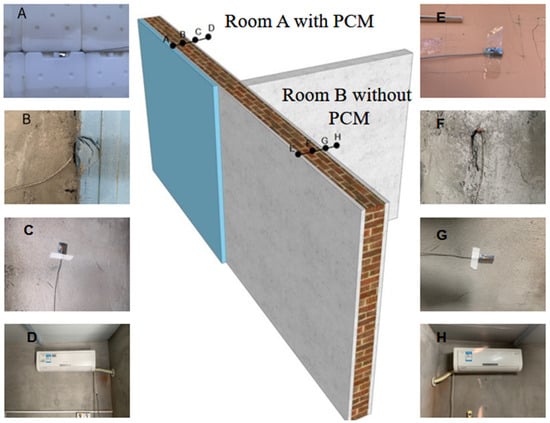 Sensor locations on the PCM wall. (A) Exterior surface of the south wall of Room A; (B) Mid-plane of the south wall of Room A; (C) Interior surface of the south wall of Room A; (D) Air conditioner location; (E) Exterior surface of the south wall of Room B; (F) Mid-plane of the south wall of Room B; (G) Interior surface of the south wall of Room B; (H) Air conditioner location.