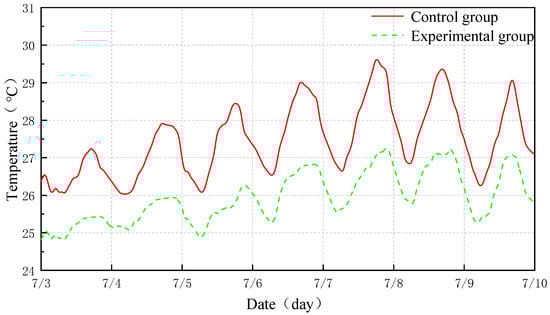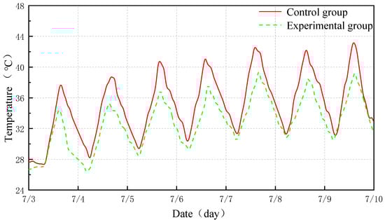 The comparative experiment was conducted in Nanchang from 3 July to 10 July 2025; the weather was clear and stable with no rainfall, representing typical summer conditions. During the experiment, both rooms had no occupancy, and all HVAC systems were kept off to ensure that only ambient factors affected wall heat transfer and indoor temperature. No heat-generating equipment was placed inside either room, eliminating internal heat sources. To evaluate the PCM wall’s ability to regulate envelope temperature, we monitored for one week under non-air-conditioned conditions and compared wall temperature variations between the two rooms to quantify the PCM effect.