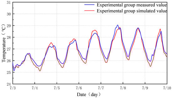 After the comparative experiment, measured temperatures were compared with EnergyPlus simulations to assess model accuracy. For the experimental room’s exterior wall surface (Figure 8), simulated and measured curves showed consistent diurnal warming–cooling behavior; most instantaneous differences lay between −2.5 °C and +1.8 °C. The statistics were RMSE = 1.05 °C and rRMSE = 3.1%, meeting the accuracy target.