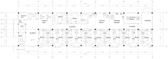 An elderly care facility in Nanchang was selected as the simulation case. The building faces south and has five stories; the gross floor area is approximately 4025.8 m2, of which 2331.72 m2 is air-conditioned, and the story height is 2.9 m. The first-floor plan is shown in Figure 13, and the 3D geometry was reconstructed in SketchUp from CAD drawings (Figure 14). The principal envelope components include the roof, exterior walls, floor slabs, interior partitions, and external windows. Materials and thermal parameters are listed in Table 4. Exterior walls adopt two configurations—a reference assembly and a PCM assembly (Table 5). Windows are double low-E insulating glazing units with U = 1.5 W·m−2·K−1 and SHGC = 0.35, providing good thermal performance. Window-to-wall ratios follow the limits for the HSCW zone in the Design Standard for Energy Efficiency of Public Buildings (GB 50189-2015): east/west ≤ 0.40, south ≤ 0.50, north ≤ 0.40 [26]. The baseline model sets south WWR = 0.50 and east, west, and north WWR = 0.40 [12]. For annual energy simulations, indoor gains were occupants 115 W per person, lighting power density 9 W·m−2, equipment 5 W·m−2 [27]. Cooling and heating loads were obtained using the EnergyPlus Ideal Loads Air System with EER = 1 [28]. Summer operation was 15 June–31 August with a 26 °C setpoint; winter was 1 December–February 28 with an 18 °C setpoint; shoulder seasons free-float without HVAC [29]. These parameters follow relevant energy-efficiency standards and published recommendations to ensure reasonable and representative boundary conditions.