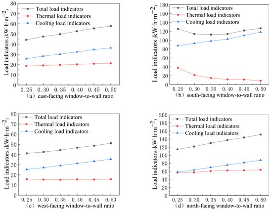 Building on the verified energy benefit of the PCM wall, the window-to-wall ratio (WWR) was introduced to analyze coupled effects. Rooms on the four orientations (east, south, west, north) were tested by varying their own WWRs, and trends in cooling load, heating load, and annual total load were evaluated with and without the PCM wall [11].