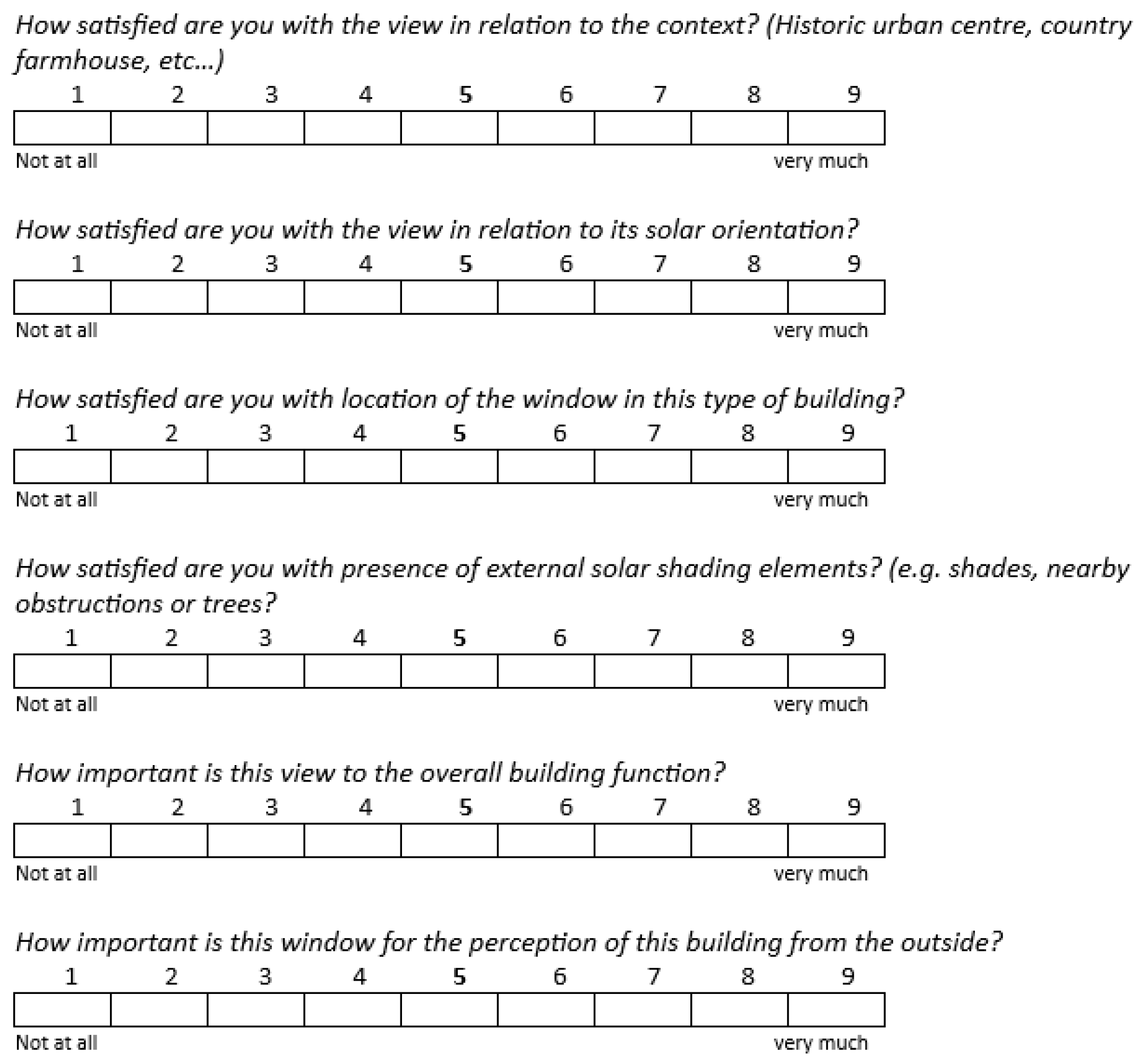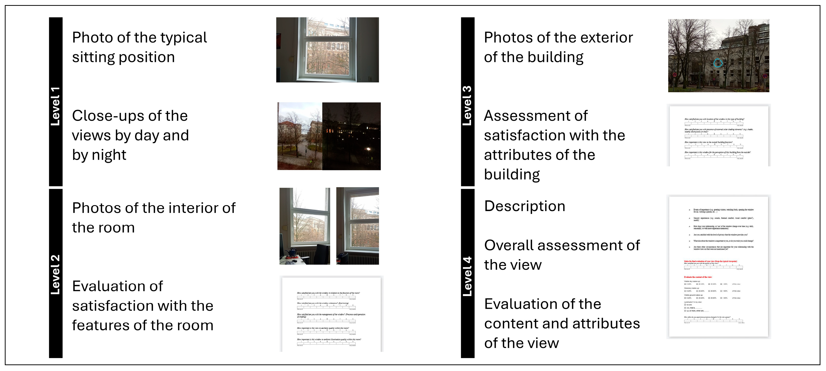 APA StyleMatusiak, B. S., Khanie, M. S., Sokol, N., Diakite-Kortlever, A., Lo Verso, V. R. M., Bellia, L., Fragliasso, F., & Mittelstädt, M. (2026). The View from the Window—Assessment by the “View Owner” and the “View Observers”. Buildings, 16(2), 371. https://doi.org/10.3390/buildings16020371