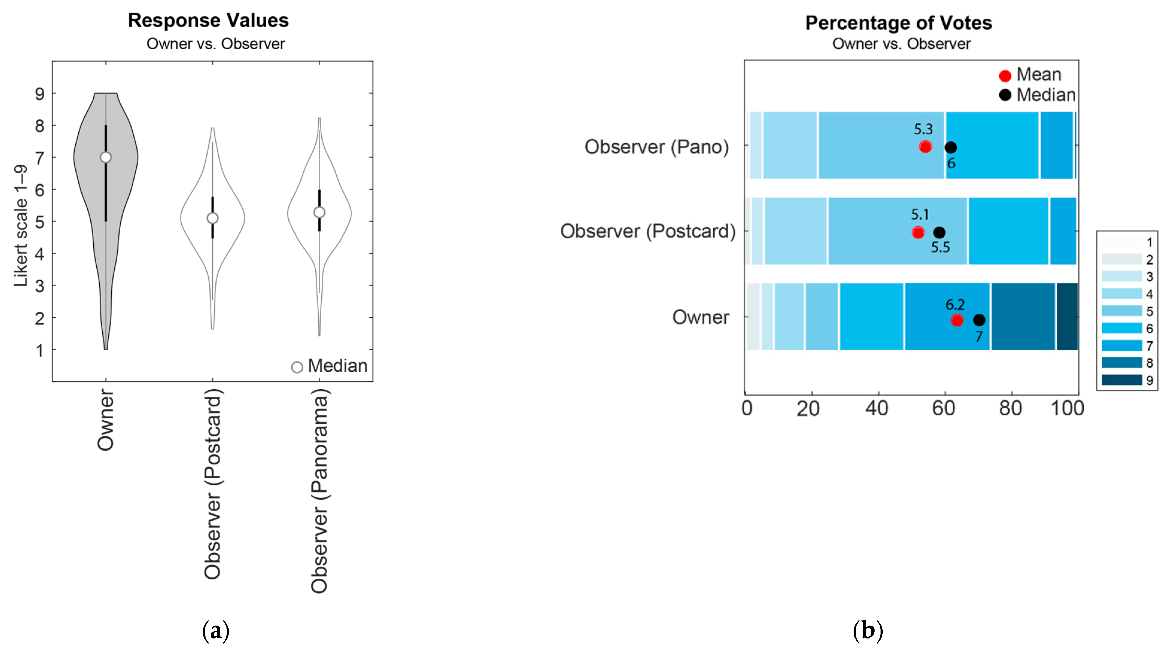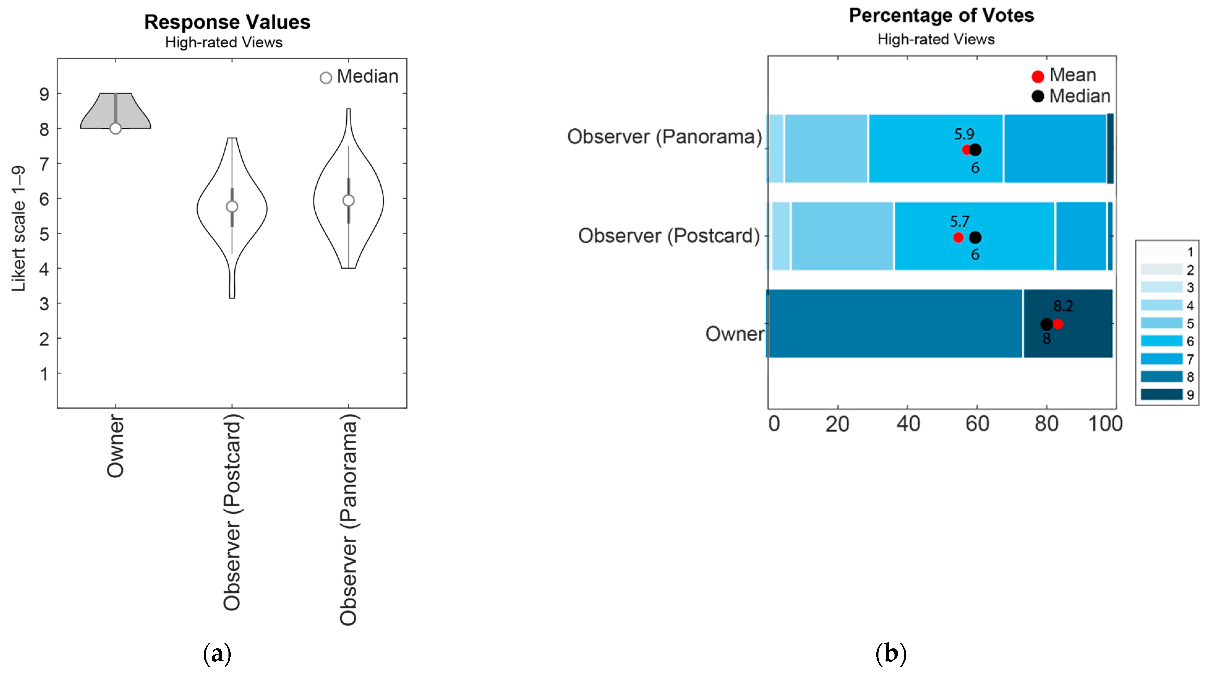 - In both high-related and low-rated views, the “view observers” have rated the panorama images slightly better than the postcard views; however, this effect is not significant.
