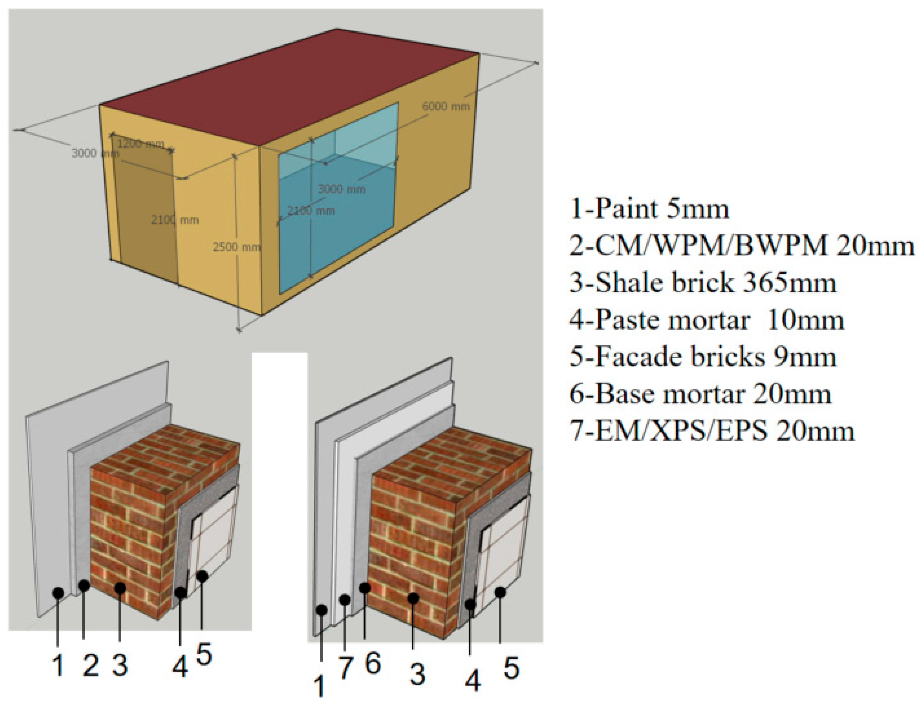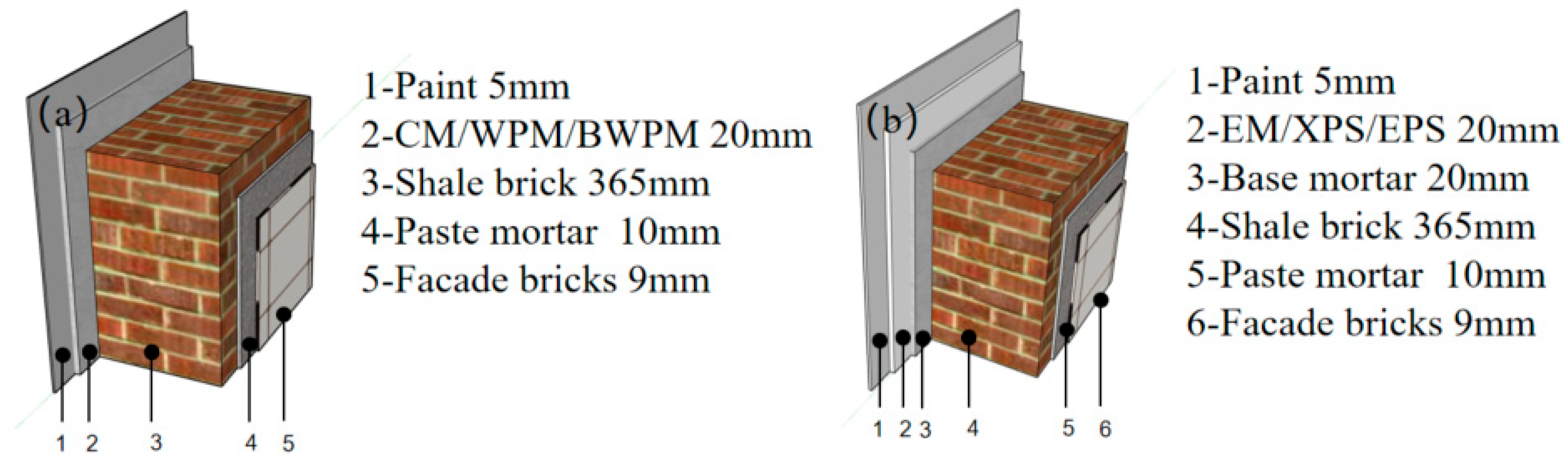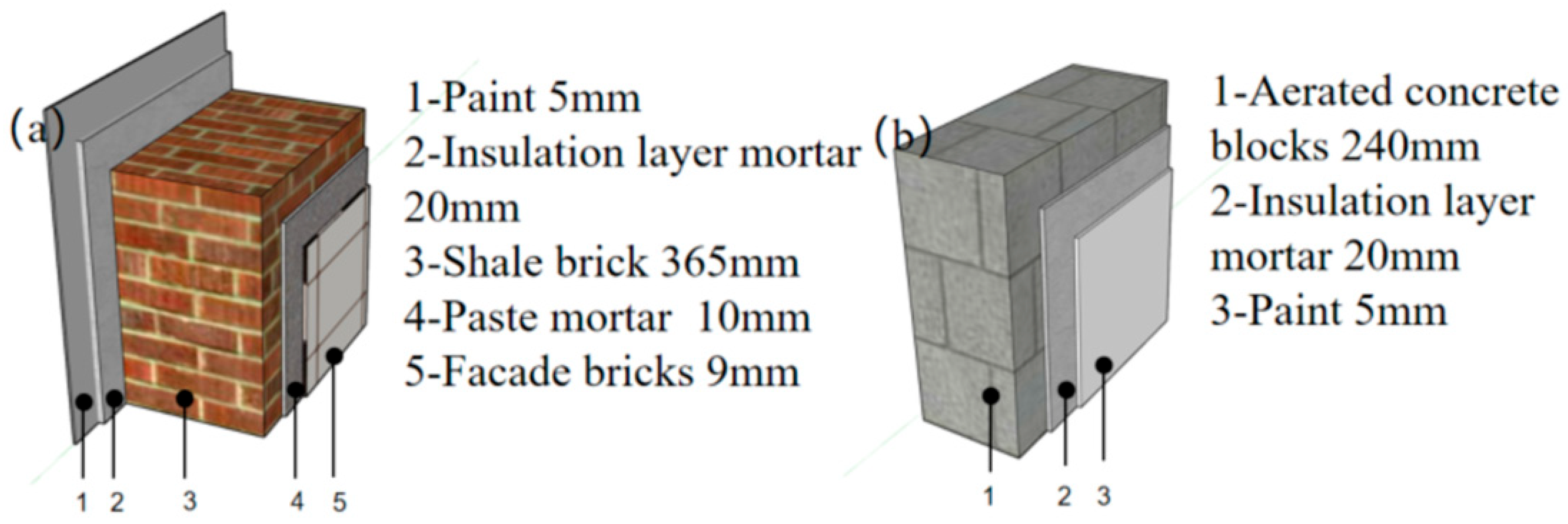 - Li, J.H.; Cao, W.L. The Heat Transfer Coefficient of Recycled Concrete Bricks Combination with EPS Insulation Board Wall. Math. Probl. Eng. 2015, 2015, 695962. [Google Scholar] [CrossRef]