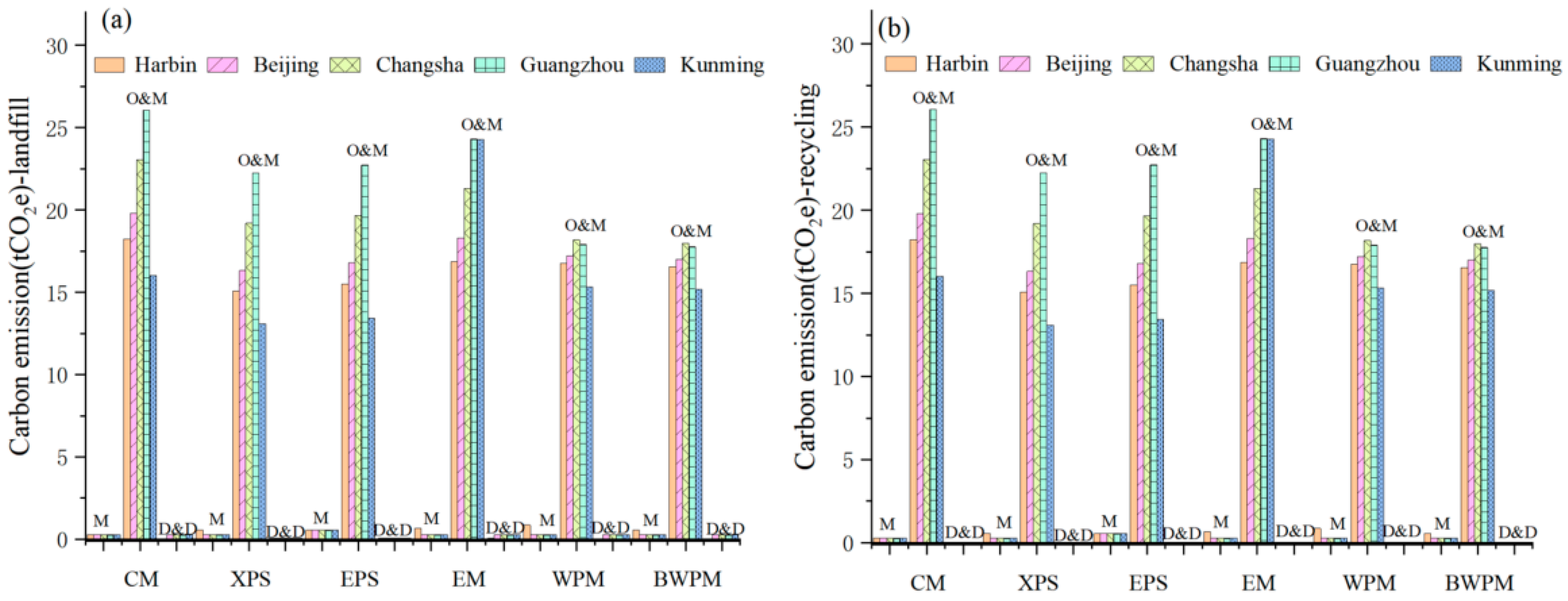 - Within the same climatic zone, different buffering materials exhibit variations in carbon emissions and life-cycle costs across the materialization, operation and maintenance, and demolition and disposal stages. A consistent finding is that the operation and maintenance stage accounts for over 90% of total carbon emissions and life-cycle costs across all materials. Therefore, life-cycle assessments of buffering materials should prioritize the impacts of this stage.