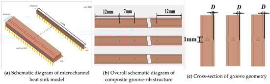 The studied groove depths (D) range from 0.2 to 0.35 mm, with an interval of 0.05 mm. The selection of these specific dimensions is rigorously justified from both fabrication and application perspectives: The chosen dimensions are well within the capabilities of modern microfabrication technologies. For instance, precision milling, a widely used technique for manufacturing metal heat sinks, can achieve feature sizes down to 100 μm (0.1 mm) with high repeatability [34]. Similarly, lithography-based techniques, suitable for silicon-based microchannels, can easily define structures at the micrometer scale. Therefore, the groove depths (200–350 μm) and channel widths (2 mm) considered in this study are not only feasible but also conducive to cost-effective mass production. The dimensions are strategically selected to address the cooling challenges of contemporary and next-generation high-power electronic devices. Localized hot spots in advanced chips (e.g., CPUs, GPUs, and 5G RF amplifiers) already exhibit heat fluxes exceeding 1000 W/cm2 [10,11], with hot spot dimensions typically on the order of several millimeters down to a few hundred micrometers.