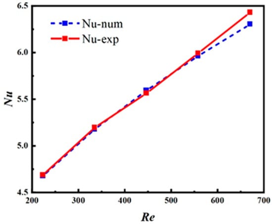 As shown in Figure 4, the Nusselt number shows a significant upward trend when the Reynolds number increases from 223 to 670. The maximum relative error between experimental and numerical Nusselt values is 2.02%, demonstrating excellent consistency. The agreement between numerical simulations and experimental data across the entire Reynolds number range validates the reliability of the fundamental numerical methods for fluid flow and heat transfer analysis.