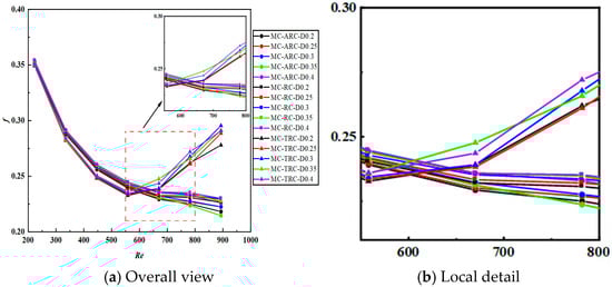 Figure 7 illustrates the variation in friction factor with Reynolds number, with the SMC benchmark for comparative evaluation. Due to the additional surface area and flow disturbances, composite structures typically exhibit higher flow resistance. Comparative analysis: The friction factors for composite configurations were 1.8–3.2 times higher than the SMC baseline; MC-TRC configurations showed the most significant increase in flow resistance at Re > 550; the trapezoidal groove’s sharp edges contributed to increased flow separation and viscous dissipation.