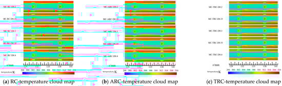 The trapezoidal groove configuration (MC-TRC-D0.35) demonstrated the most uniform temperature distribution with the lowest average wall temperature, indicating superior heat transfer efficiency at high Reynolds numbers. This performance advantage is attributed to the enhanced fluid mixing and boundary layer disruption caused by the sharp geometric features of trapezoidal grooves (Figure 8).