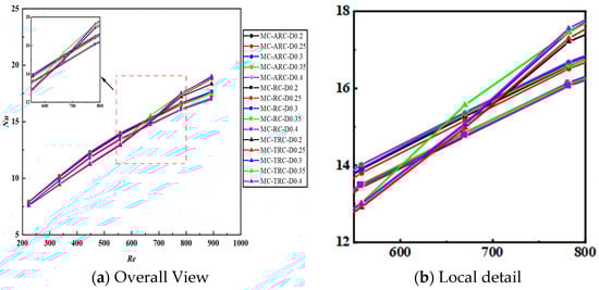 While the differences in Nusselt numbers between various groove configurations appear negligible in numerical values, they exhibit clear and systematic trends that vary with Reynolds number and groove geometry. These trends align closely with the observed flow field structures (Figure 6) and friction coefficient variations (Figure 7). Considering the previously conducted mesh independence validation (error < 0.5%), experimental verification (maximum error 2.02%), and literature data validation (Nu number error 1.87%), we have maintained the numerical uncertainty at a low level. Therefore, we conclude that the observed performance differences are genuine, reflecting inherent physical mechanism variations in different composite structures regarding turbulent flow and enhanced heat transfer.