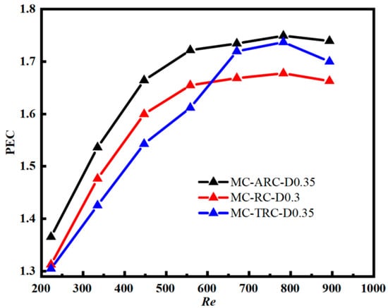 A PEC (Performance Evaluation Criterion) analysis was conducted using the SMC benchmark for explicit comparison, providing a comprehensive assessment of thermohydraulic performance trade-offs. Figure 10 displays the PEC values for all configurations, demonstrating the net benefits of each design relative to conventional microchannels. Benchmark reference performance evaluation: The SMC baseline serves as the reference point (PEC = 1.0); All composite configurations achieved PEC values greater than 1.0, confirming their overall performance superiority; The optimal configuration MC-ARC-D0.35 achieved a maximum PEC of 1.7495, representing a 74.95% overall improvement over the SMC baseline; Performance improvement ranking at Re = 670: MC-ARC-D0.35: 74.95% improvement over SMC; MC-TRC-D0.35: 73.73% improvement over SMC; MC-RC-D0.30: 67.77% improvement over SMC.